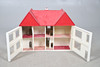 A two storey dolls house, accessed from the front and back with a staircase and multiple rooms on each level, 60cm x 35cm x 46cm high.