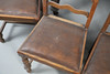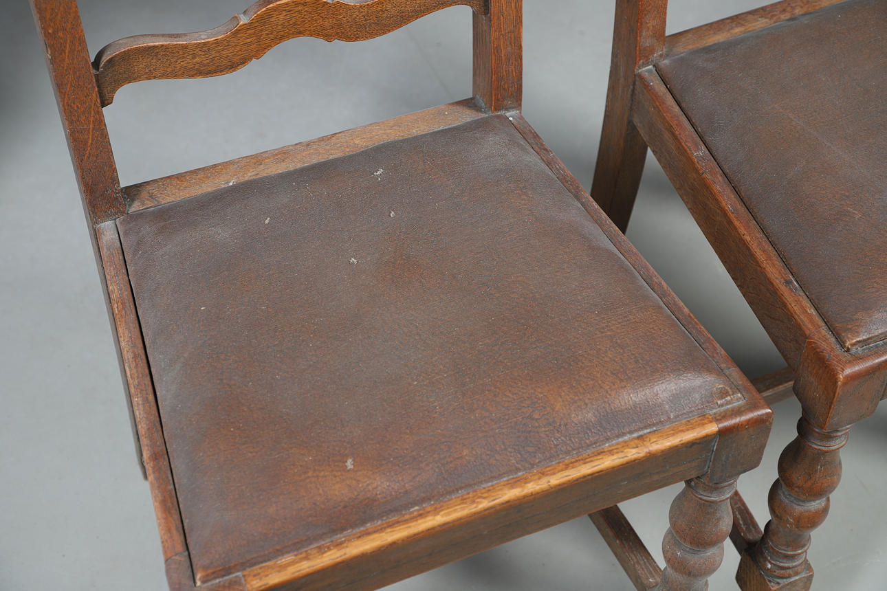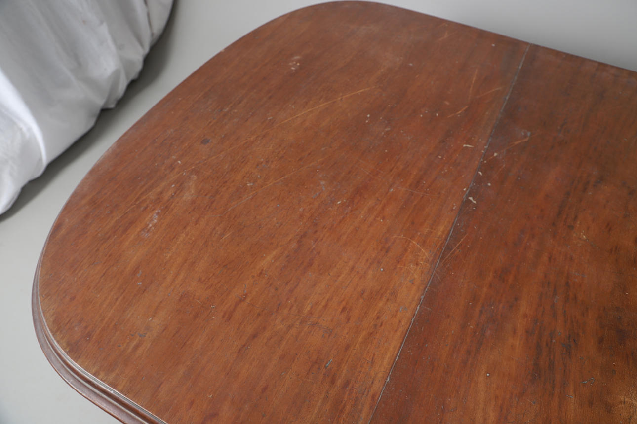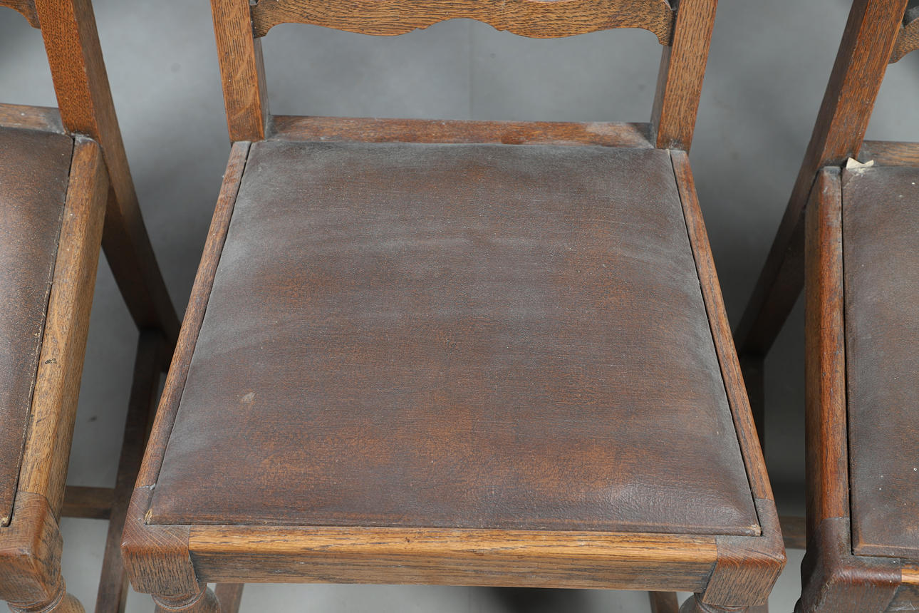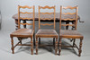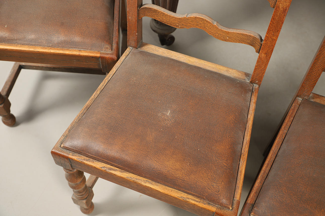 Table functioning but faded and in need of cleaning, with scuffs, scratches and other imperfections. Chairs scratched and faded with some upholstery damaged. See online images.