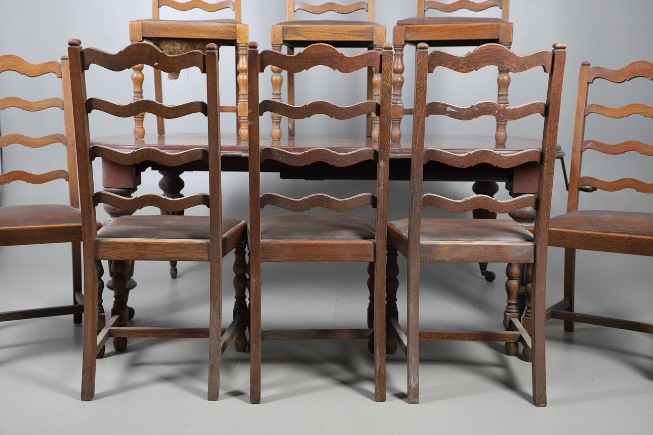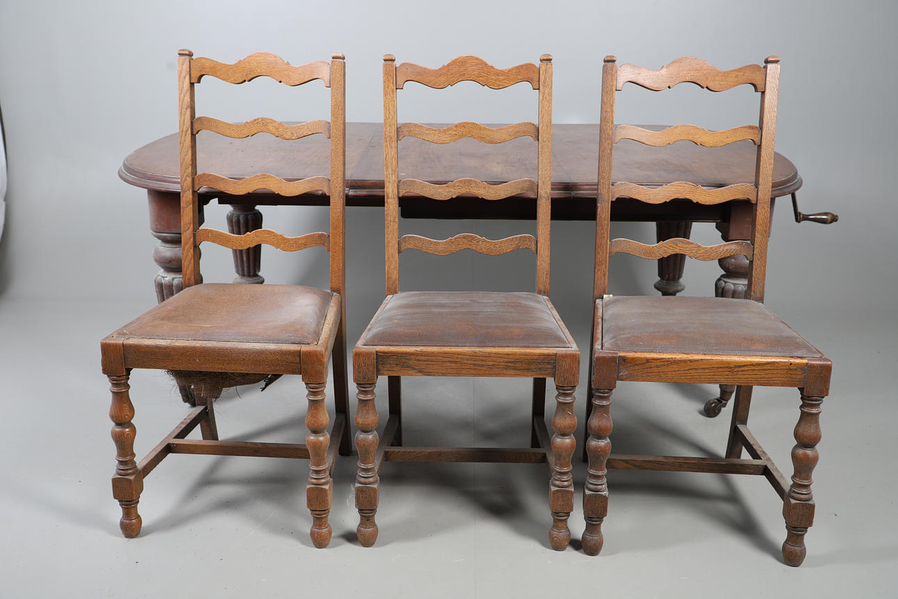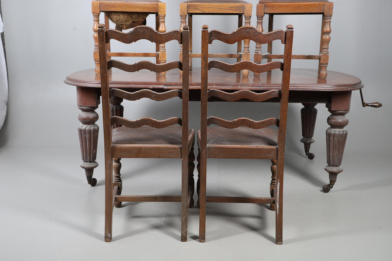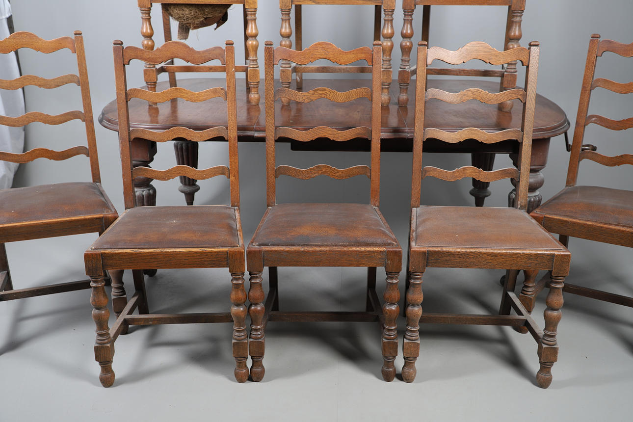Table extendable with wind-out mechanism, raised on turned fluted columns on casters, W105 x H72 x L187cm, together with eight ladder backed oak dining chairs with faux leather upholstery, W46 x H100 x D45cm (9).