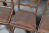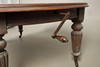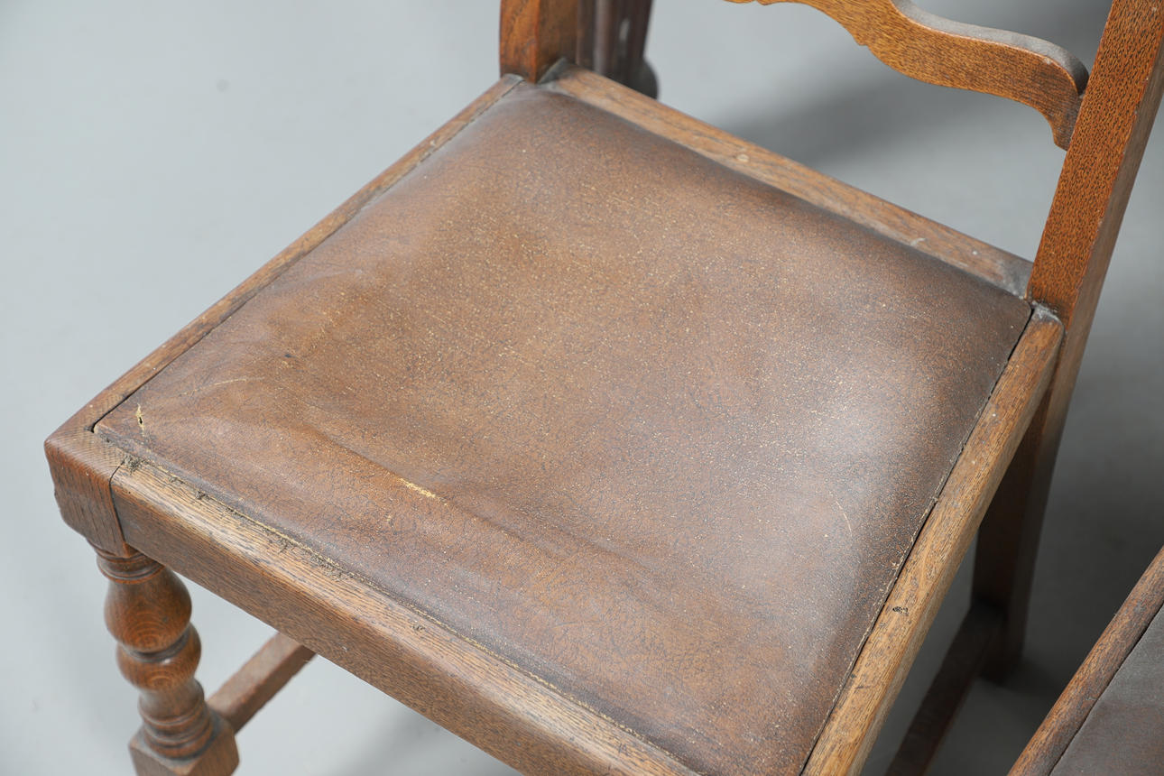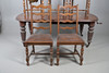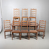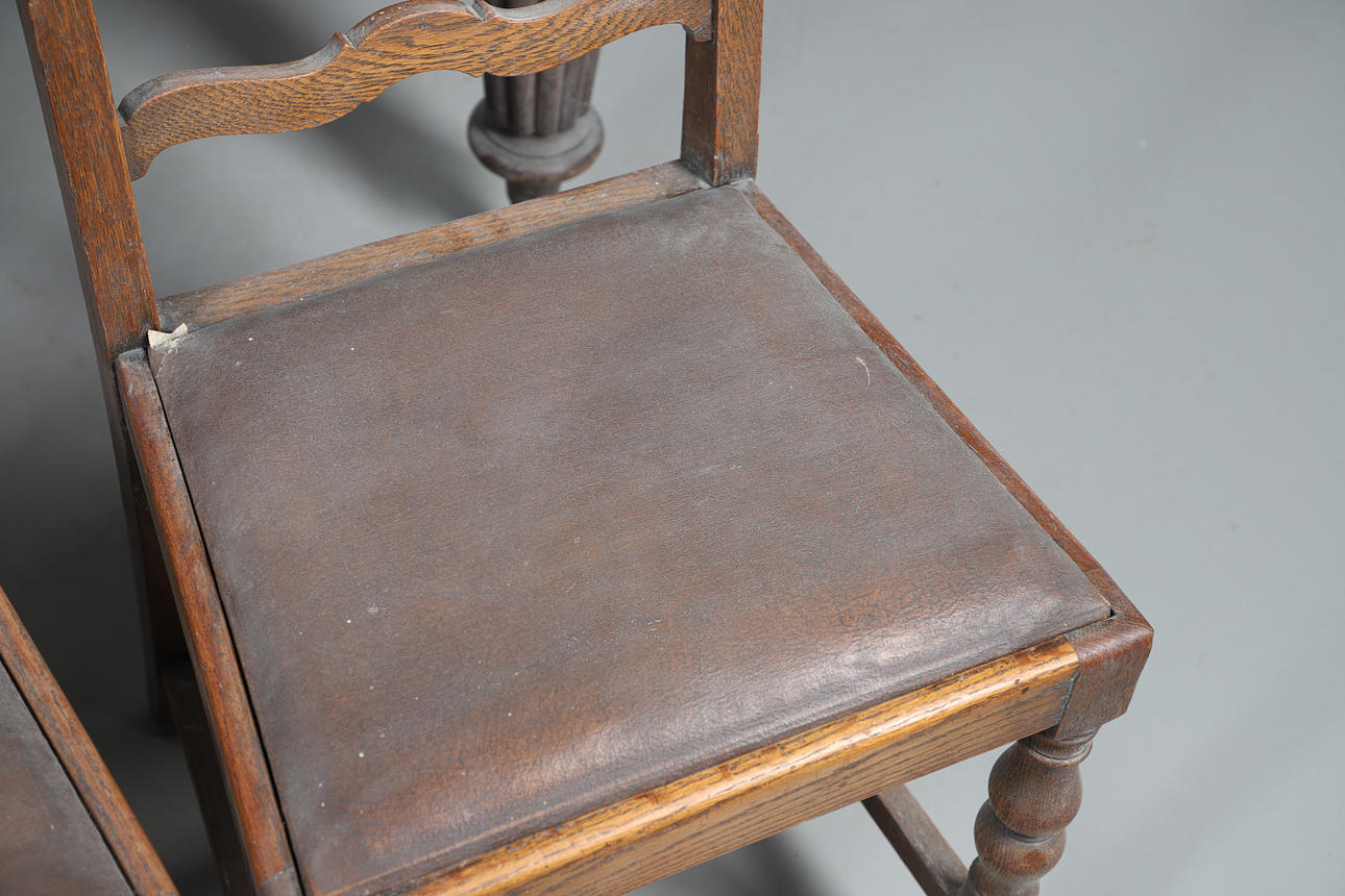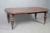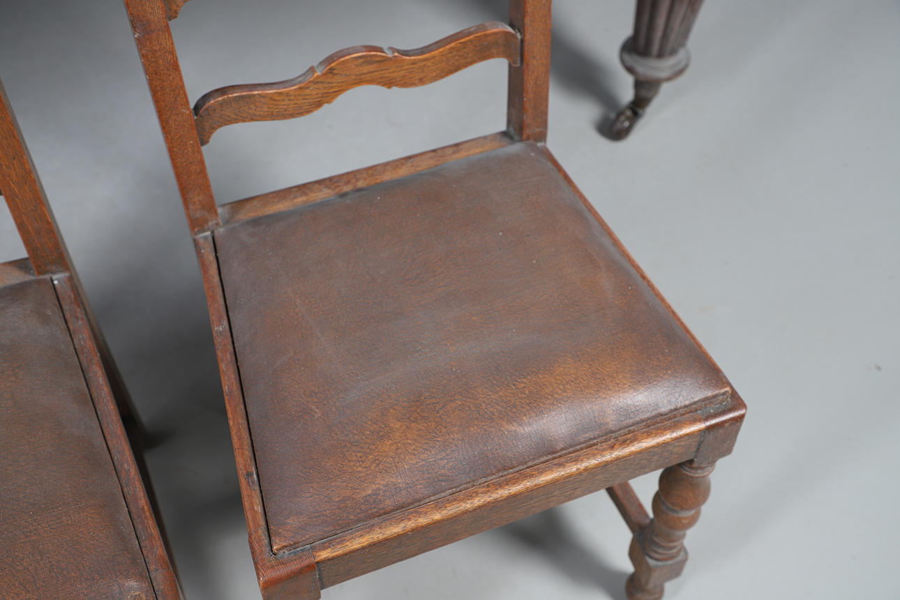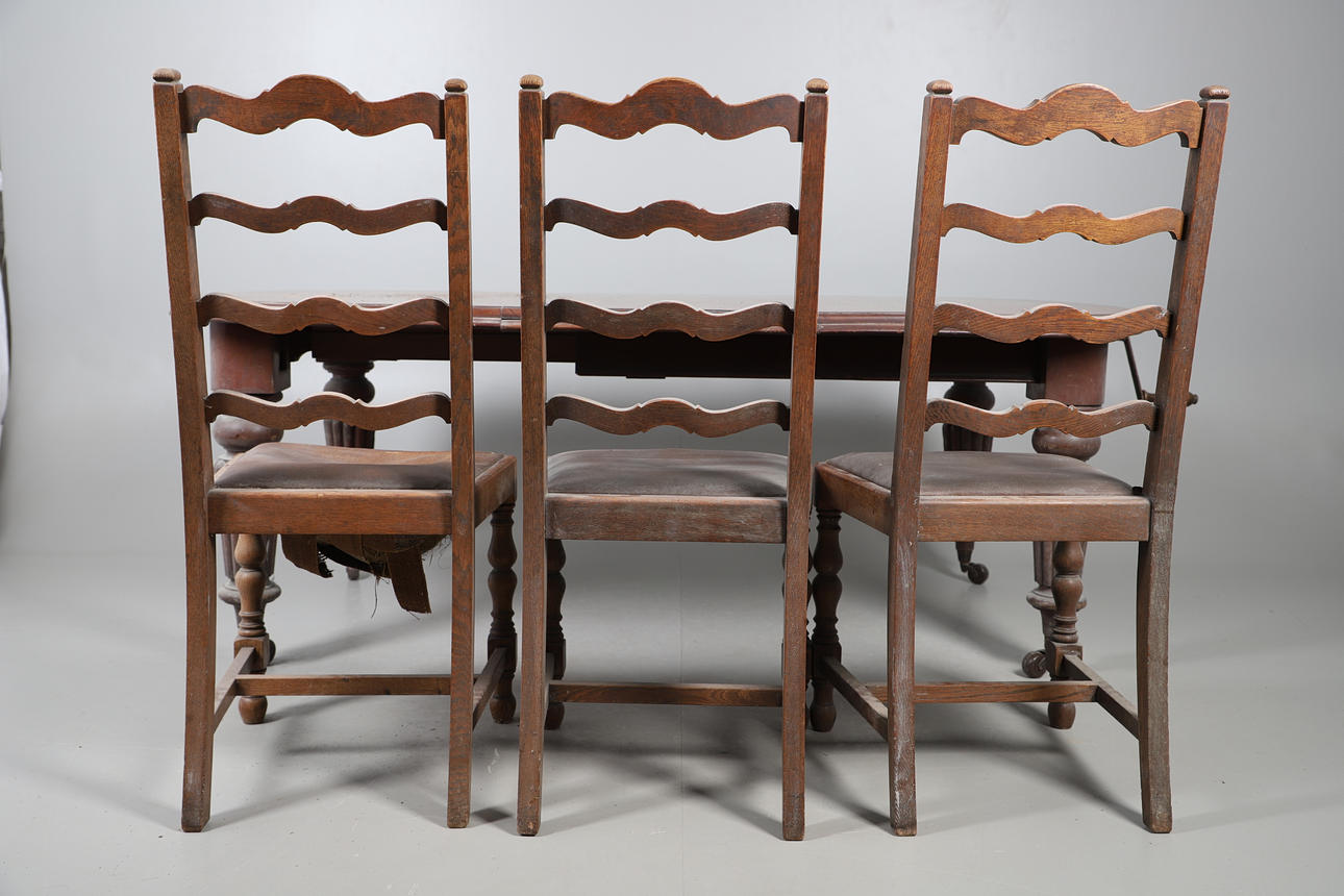 Table extendable with wind-out mechanism, raised on turned fluted columns on casters, W105 x H72 x L187cm, together with eight ladder backed oak dining chairs with faux leather upholstery, W46 x H100 x D45cm (9).