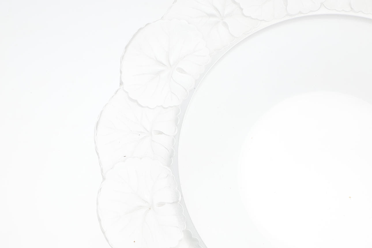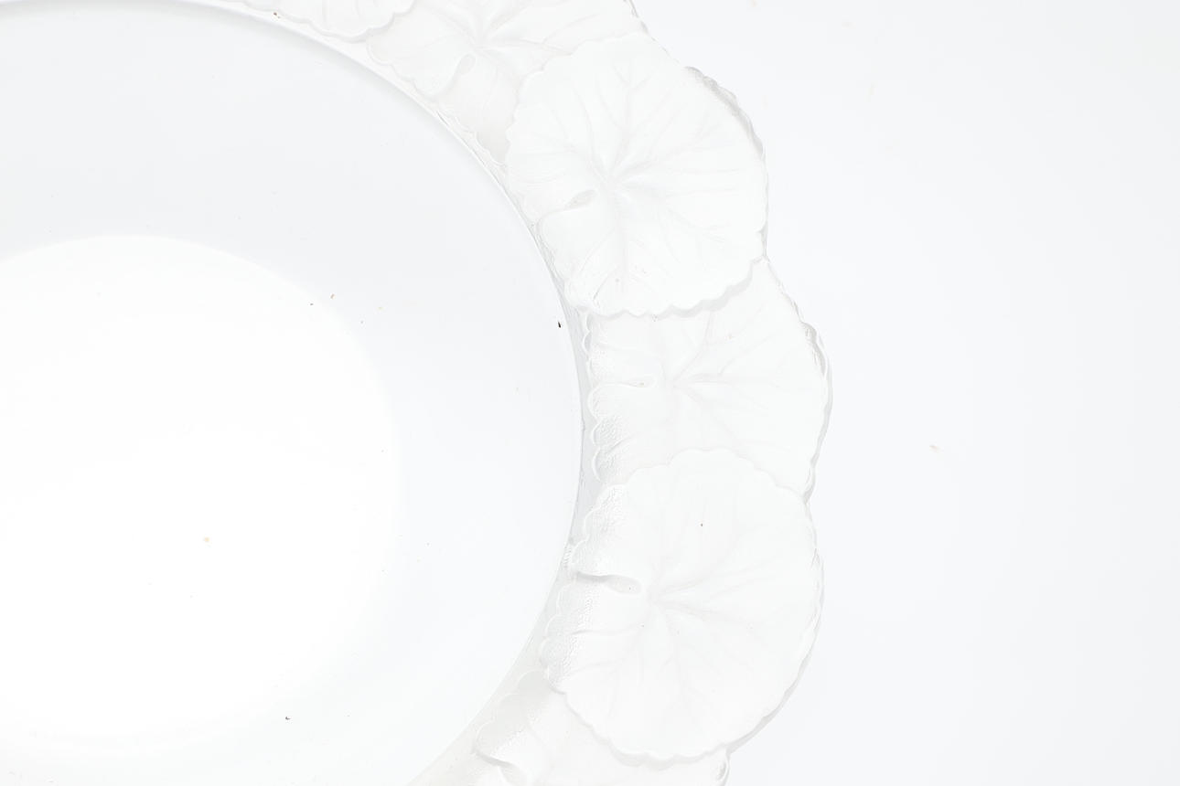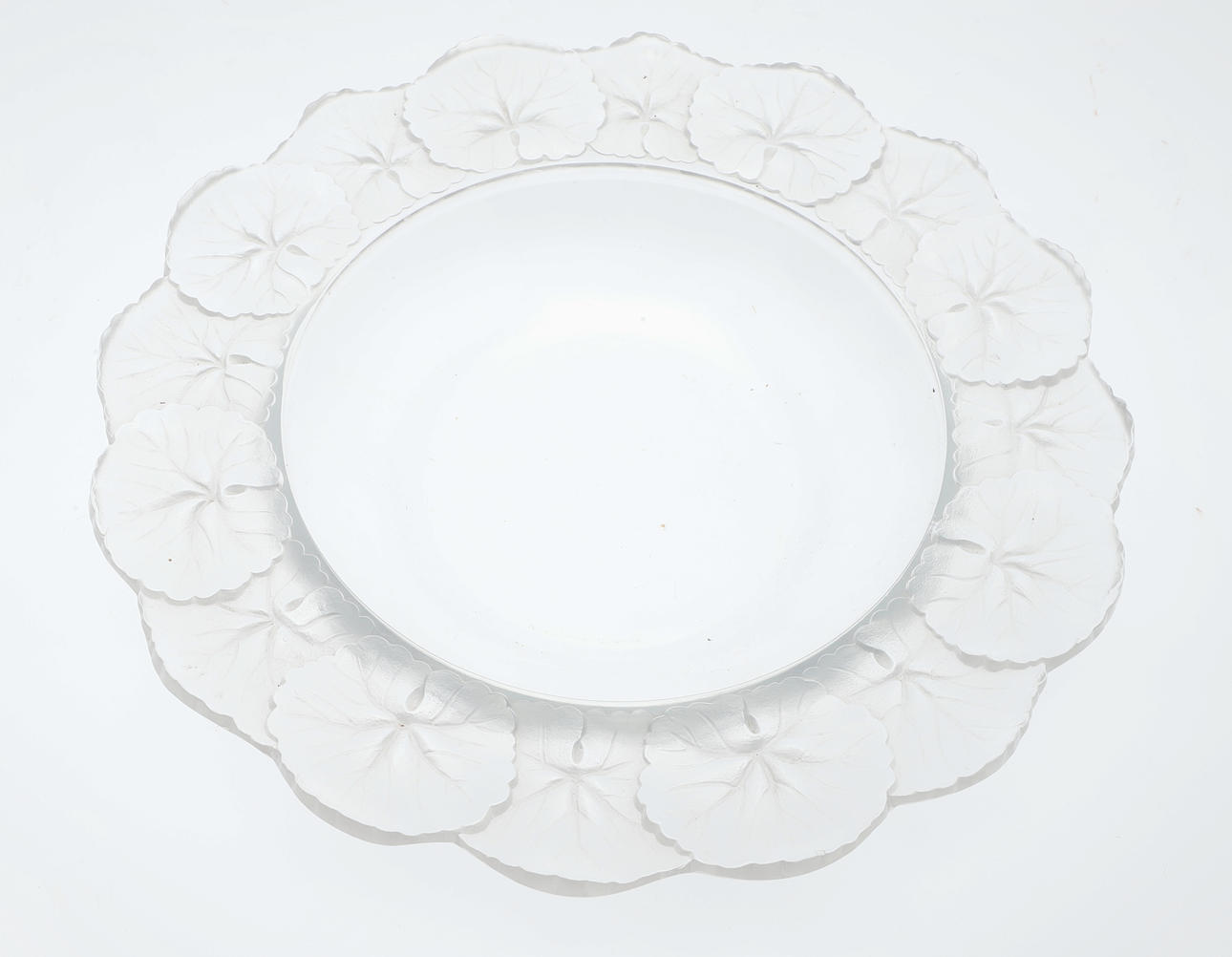 A modern Lalique clear and frosted glass bowl in the Honfleur design, moulded with flower heads around the rim. Signed to the base, Lalique, France. 27.5cms diameter.