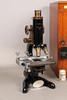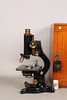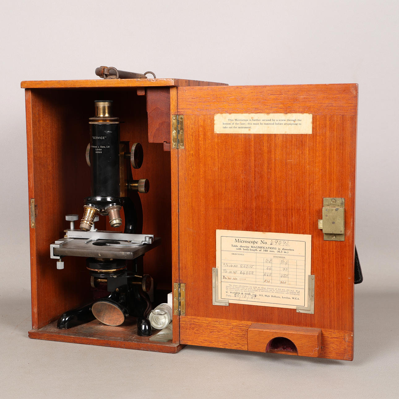 The Microscope by W. Watson & Sons, Ltd. of London, serial number 69593, housed in a wooden Watson case which measures 41cm height, 23cm width, 25cm depth.