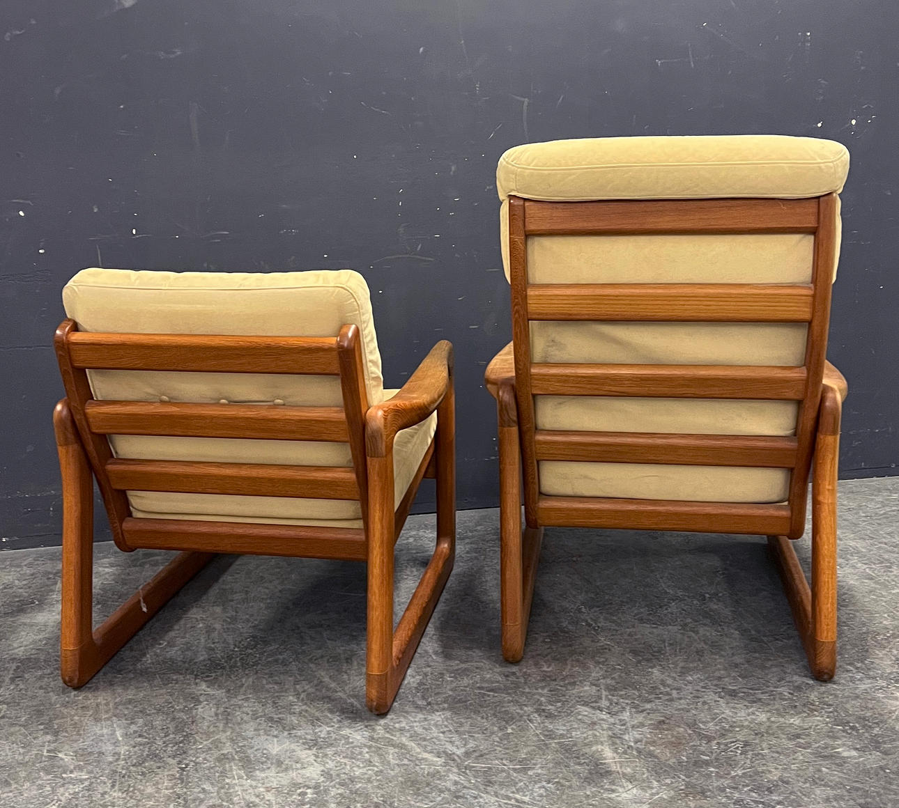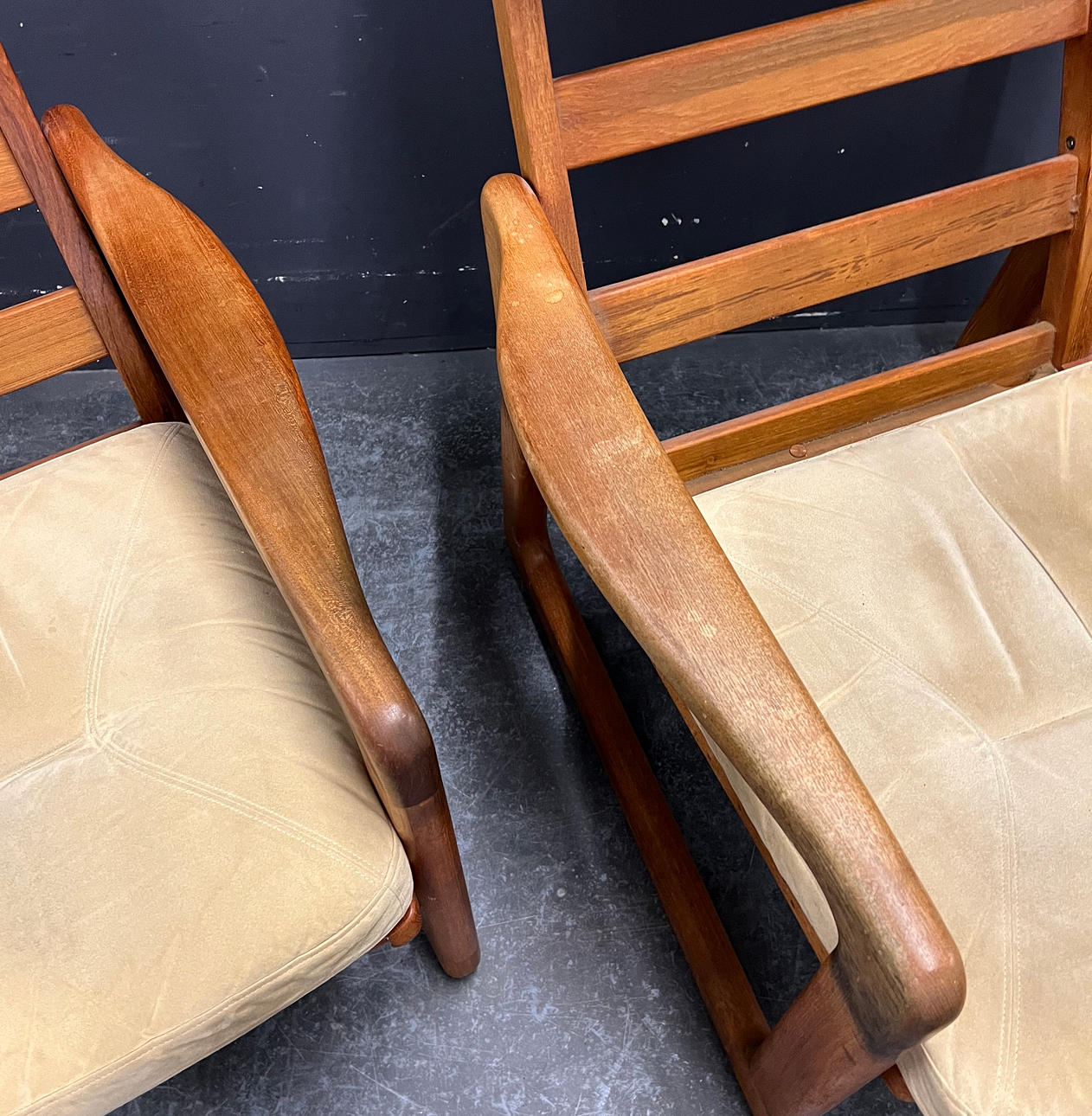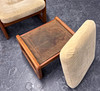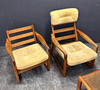 Teak frame with removable cushions. Height approx. 78-100cm, seat height approx. 40cm, width approx. 70cm, depth approx. 74cm.