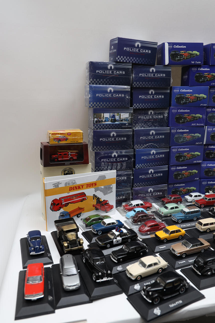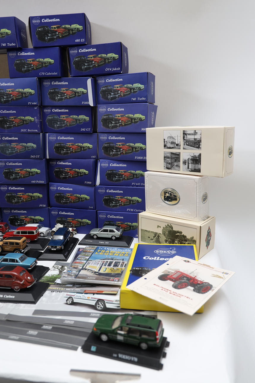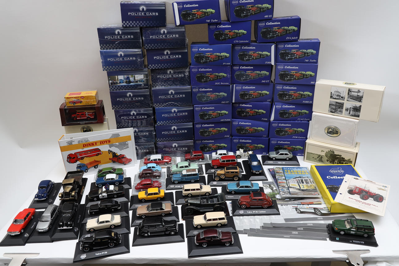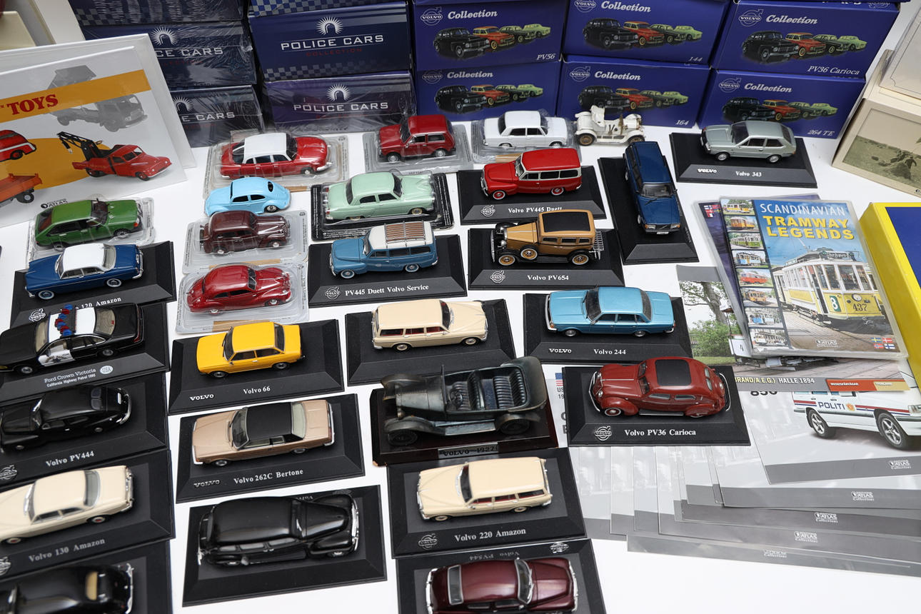 72 Volvo cars, police cars, and others. Also various trains, posters, and display stands. Length of car box 17 cm.
