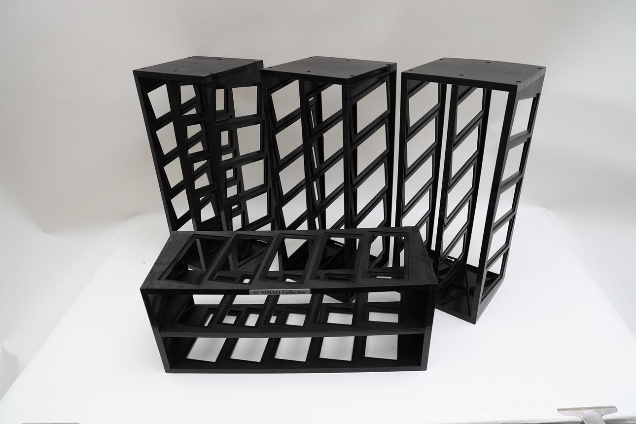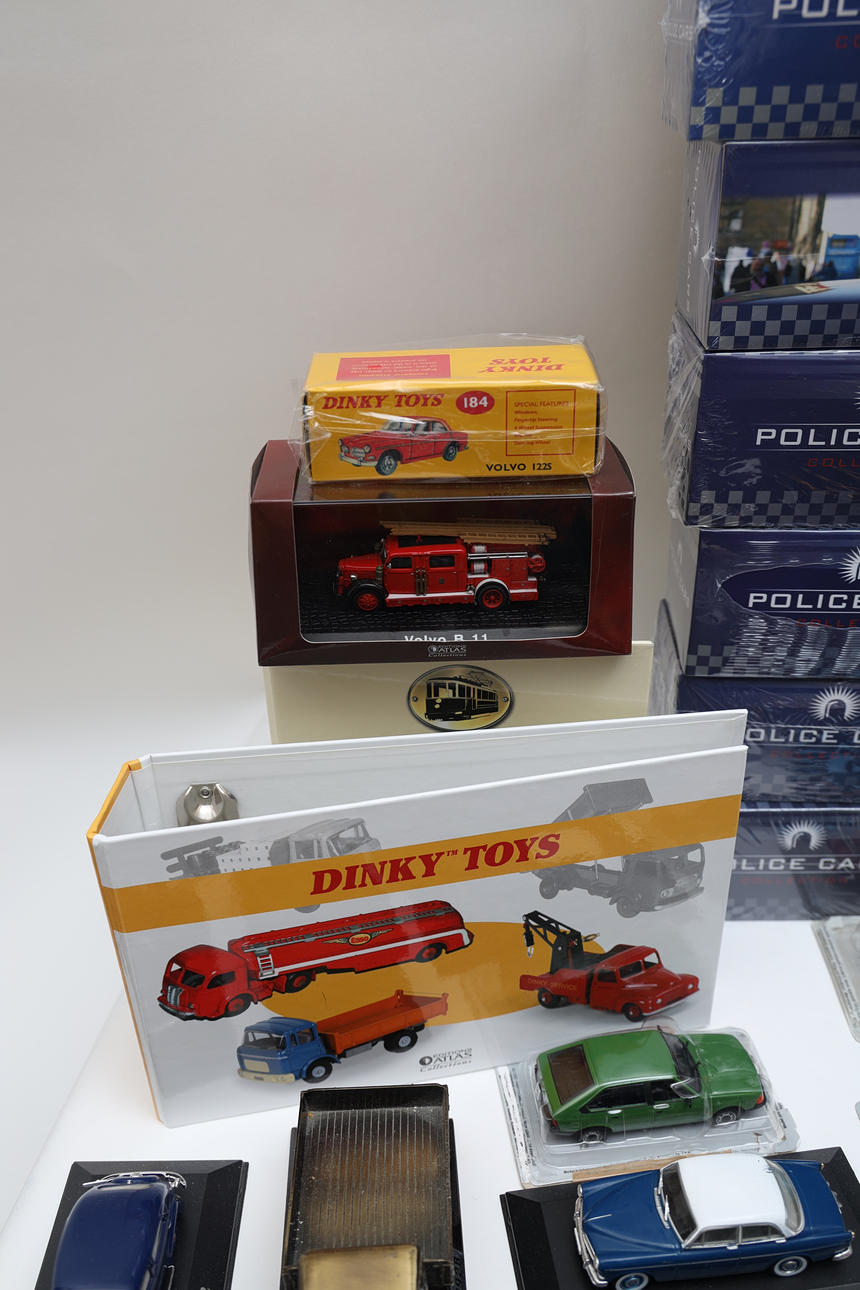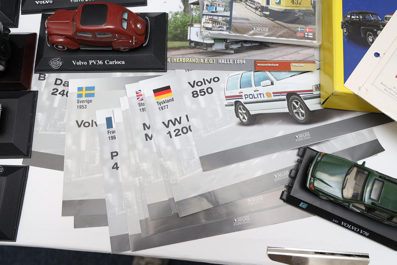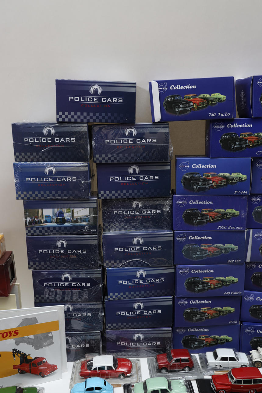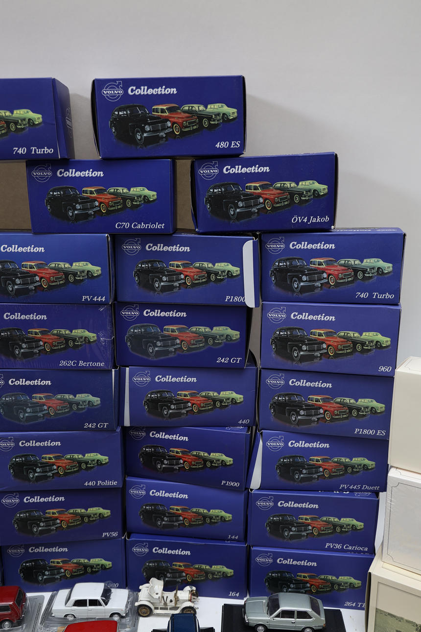 72 Volvo cars, police cars, and others. Also various trains, posters, and display stands. Length of car box 17 cm.
