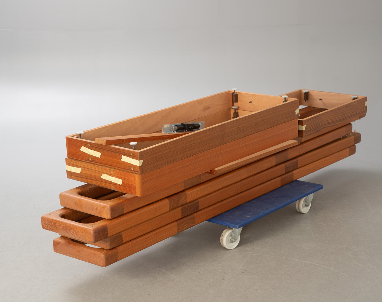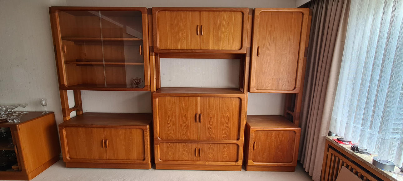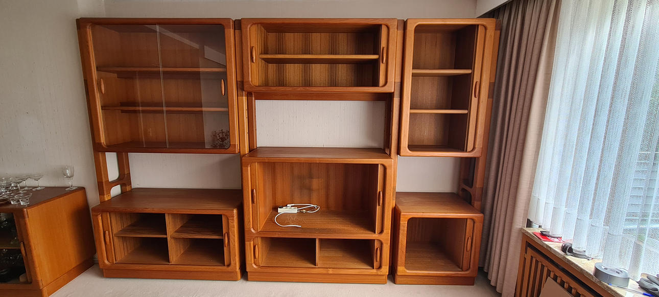 In total: 6 modules and side panels, as well as shelves for the cabinets. Total height approx. 210 cm x W 308 x D 52 cm. Screws included.
