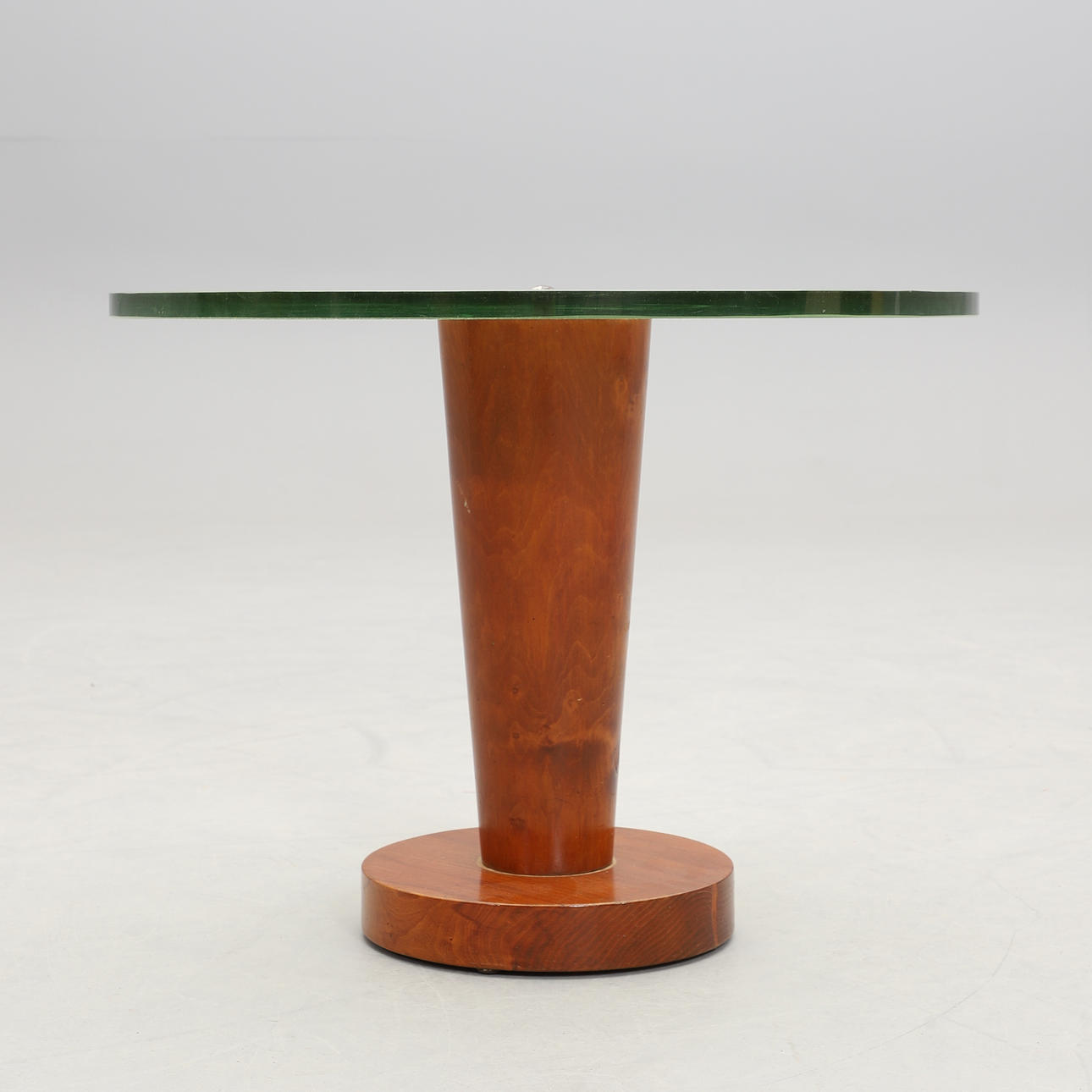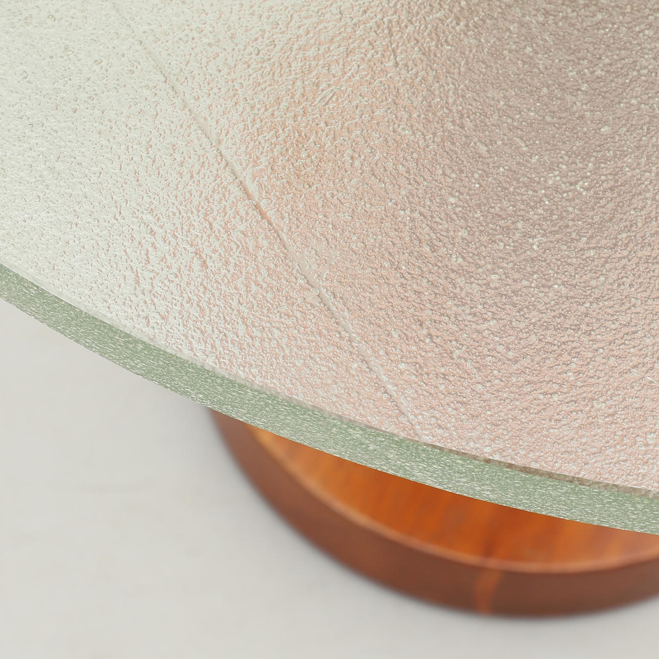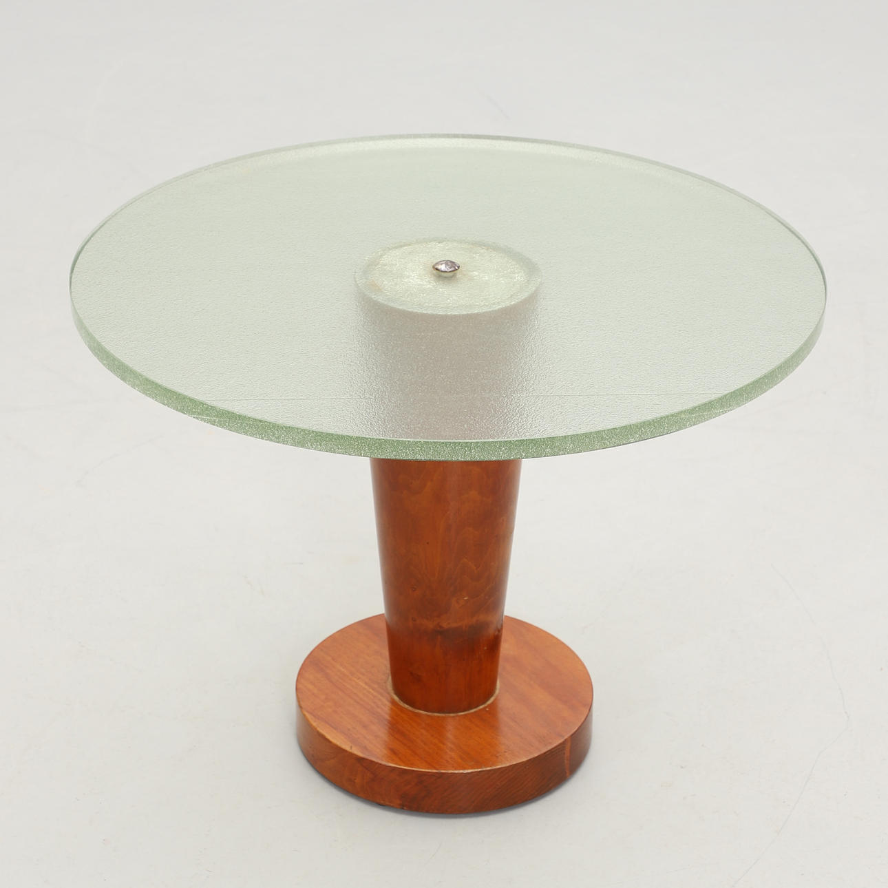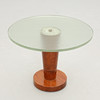 Round thick raw glass top, veneered polished base. Diam 68, height 50 cm.