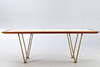 Teak veneer. Top with small mosaic tiles. Brass hairpin legs.