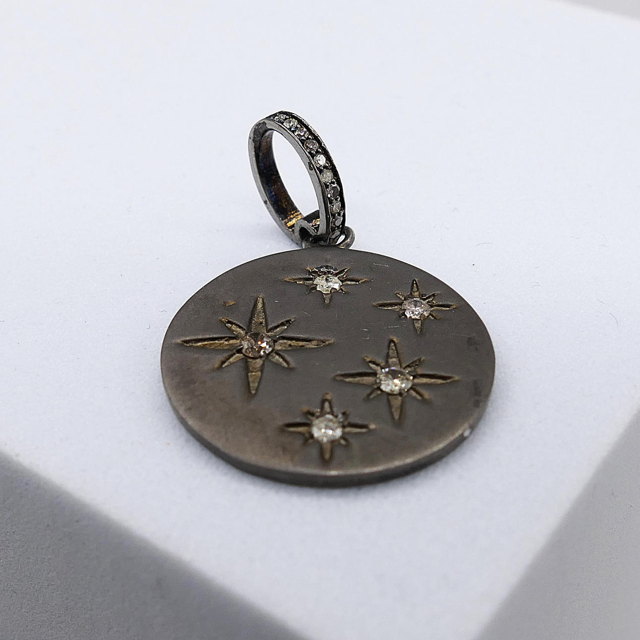 A silver disc pendant constellation-set with 5 diamonds, with further diamonds to the loop