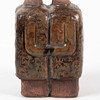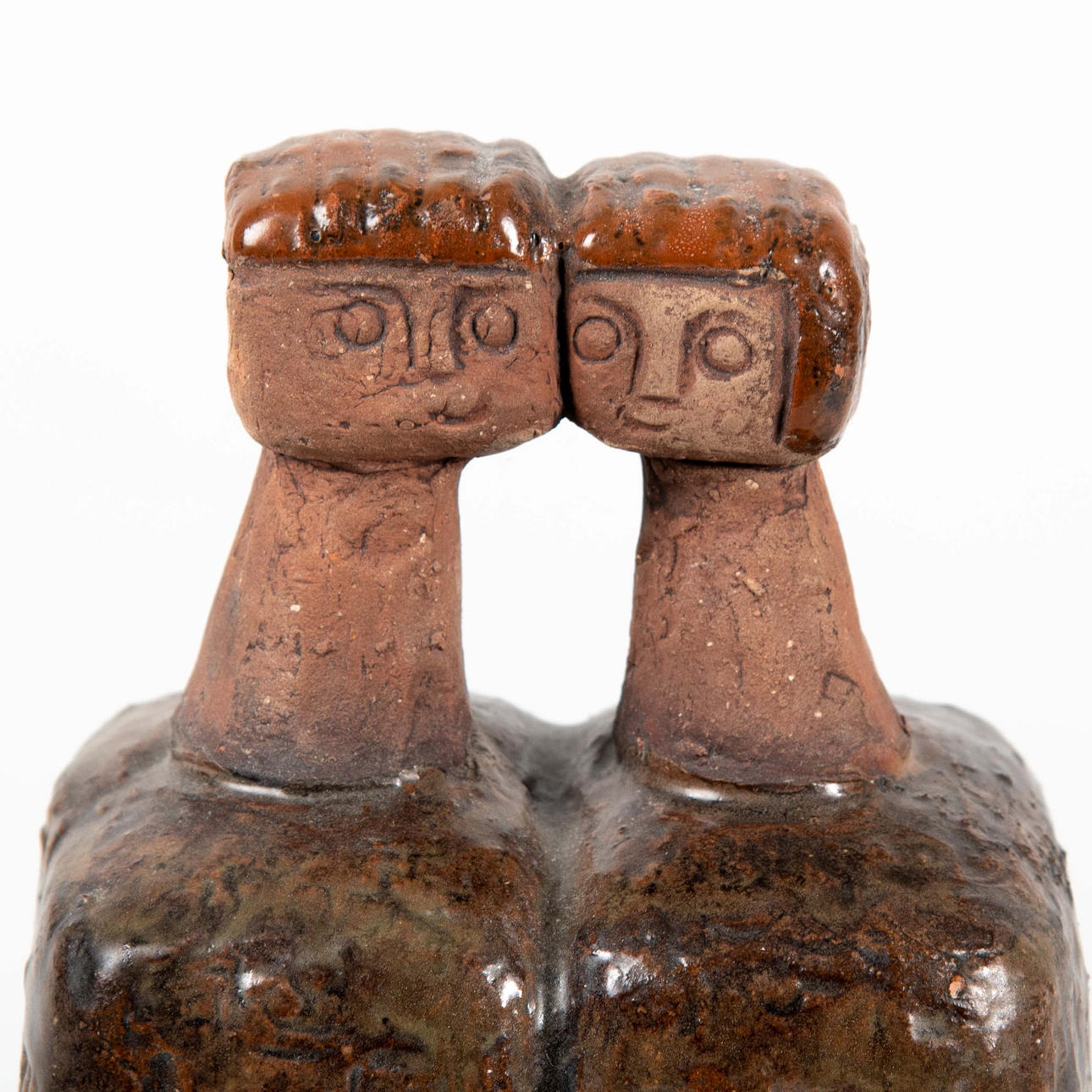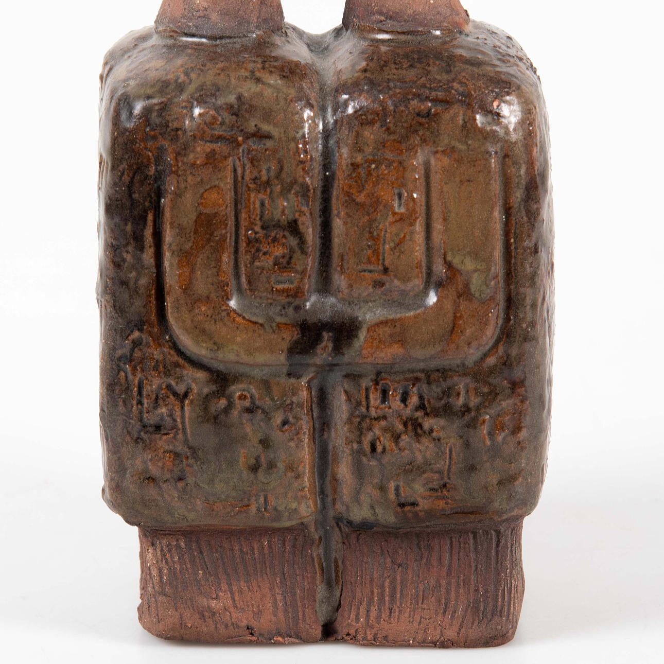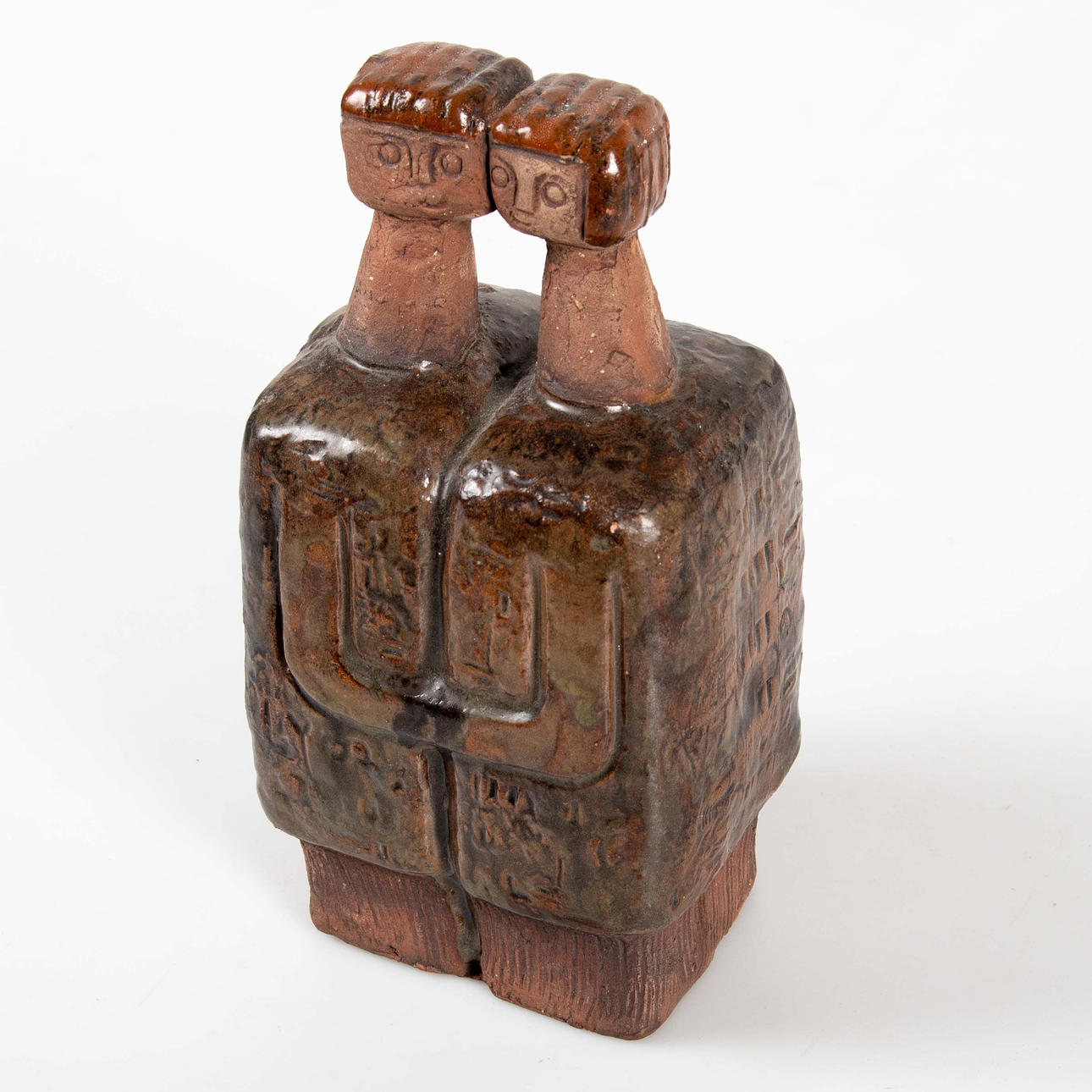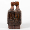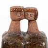 Figurative composition in the form of two conjoined figures with stylized faces. Relief decoration with incised and modeled details.