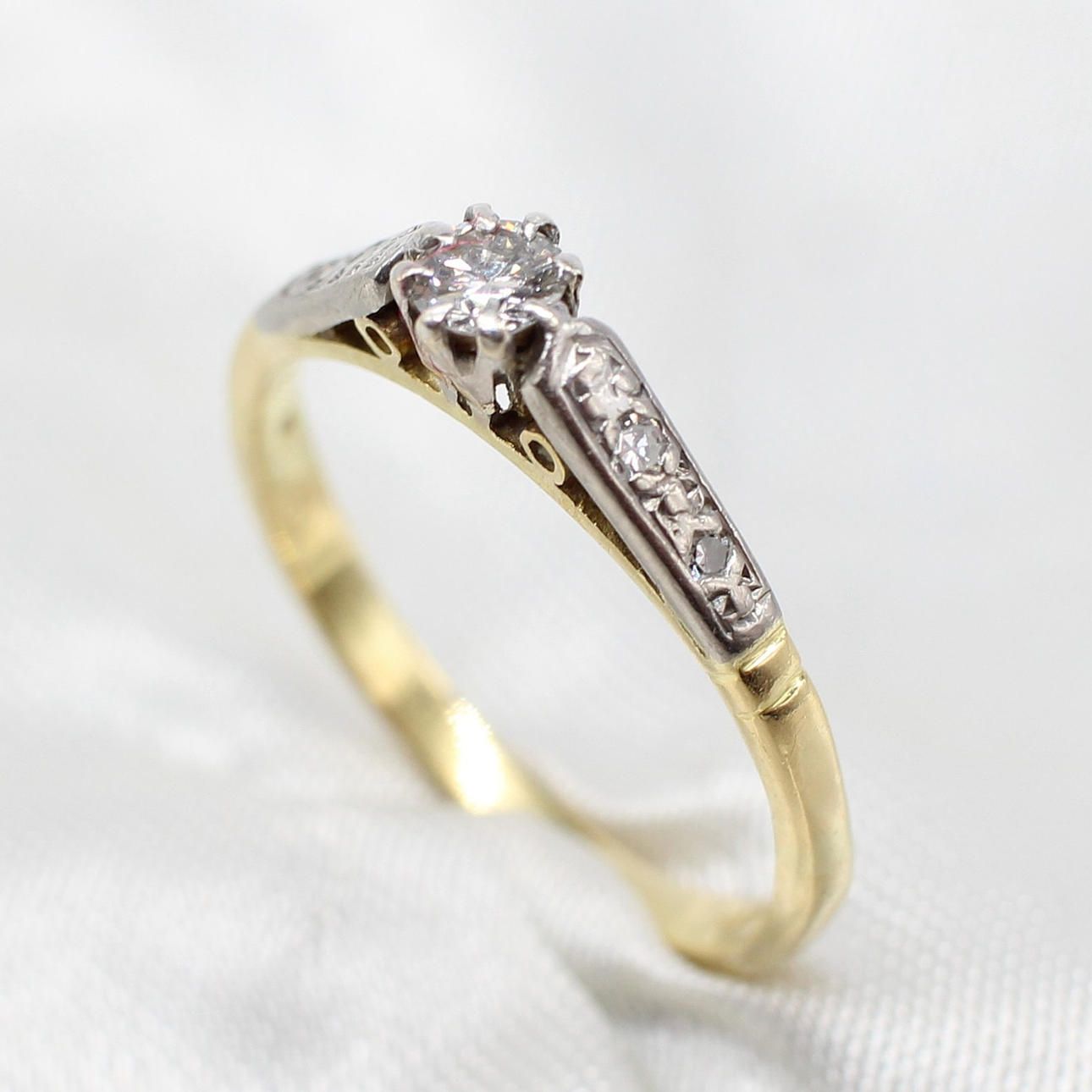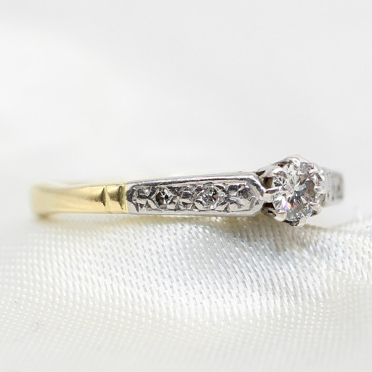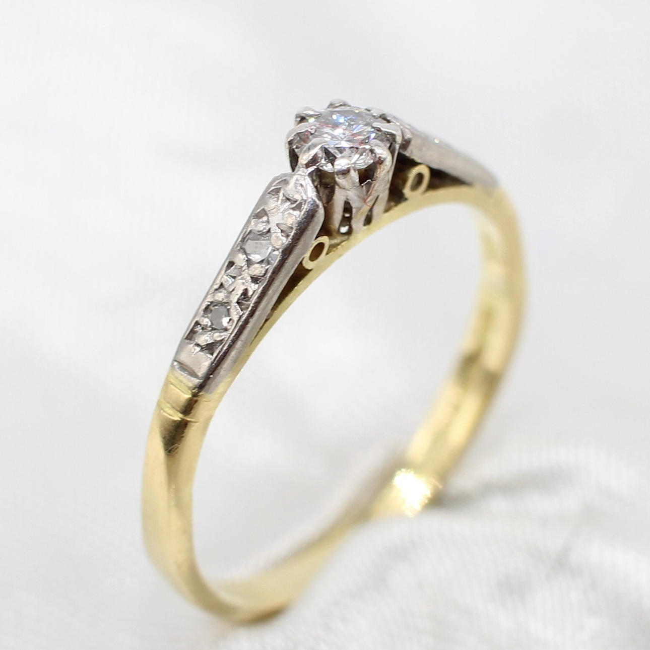 An 18K Vintage Yellow Gold And Platinum (Hallmarked) Round Brilliant Cut Diamond Solitaire Ring With Diamond Set Shoulders.
