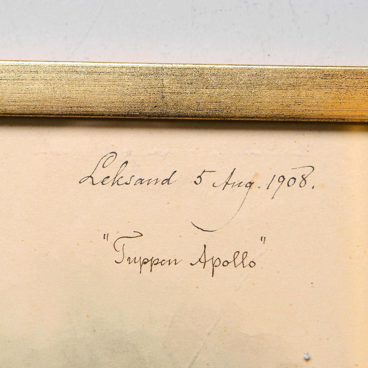 5040695. OIDENTIFIERAD KONSTNÄR. "Tuppen Apollo", watercolour, Leksand, dated 1908.