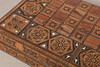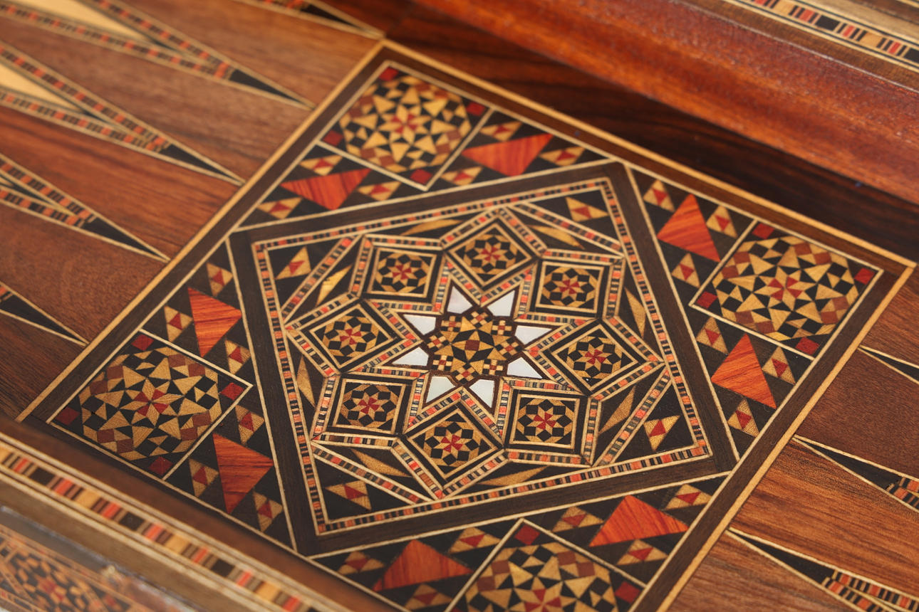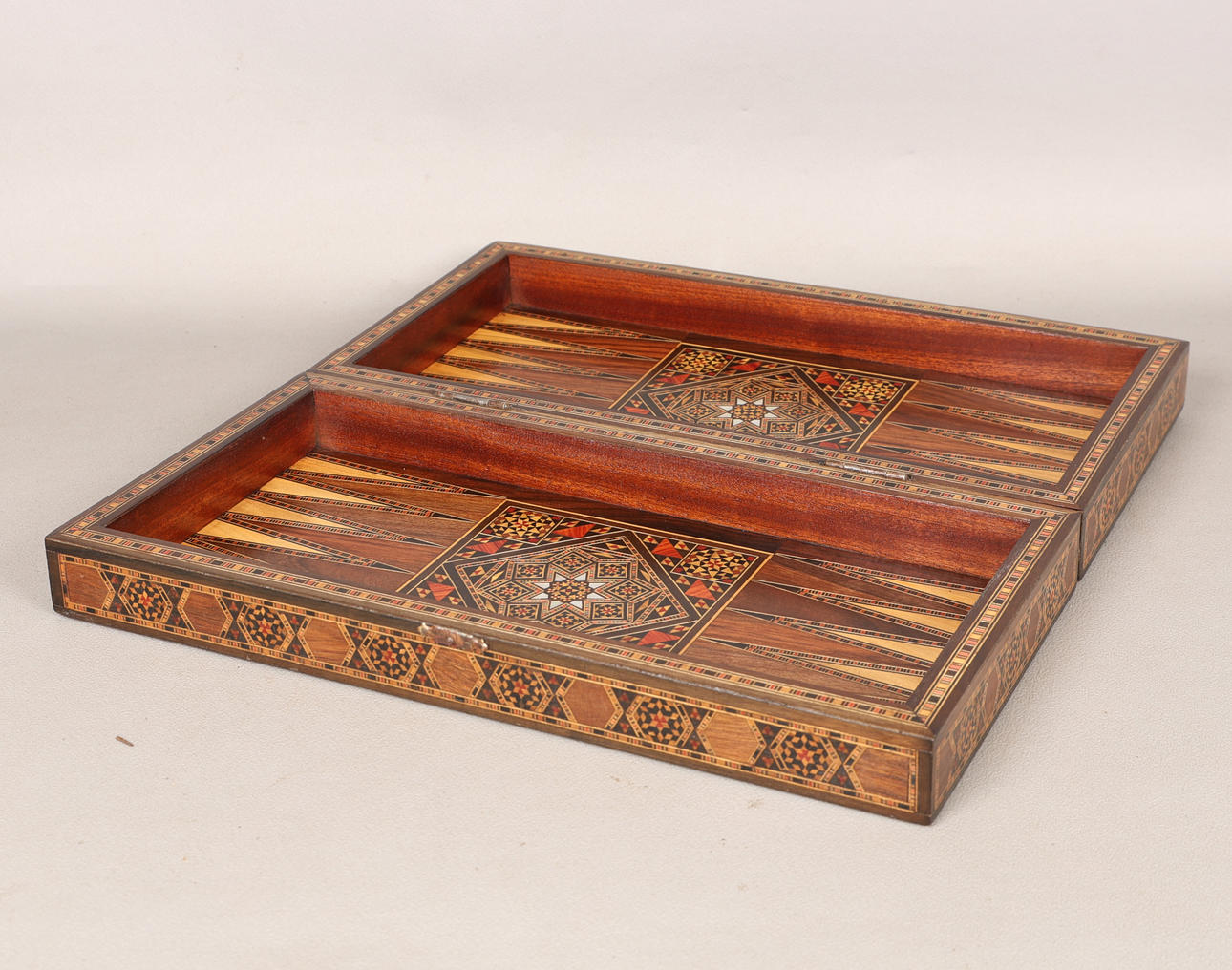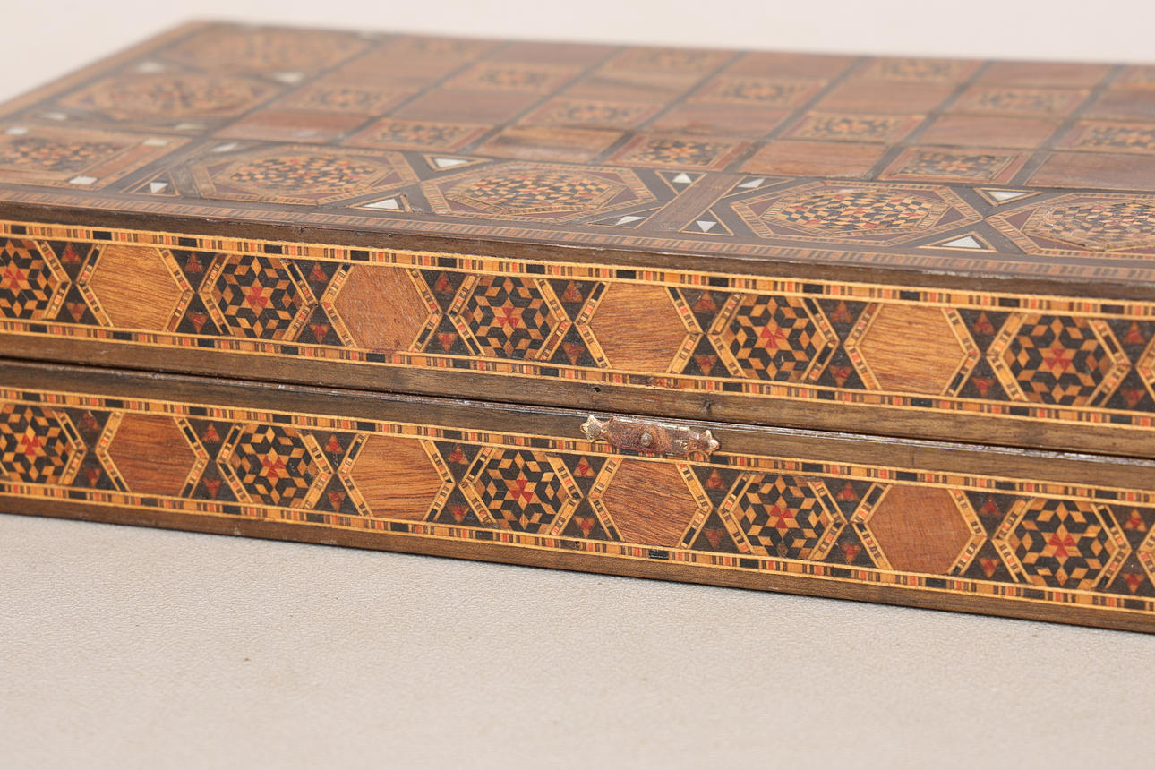 A DAMASCUS PARQUETRY INLAID BACKGAMMON BOX.