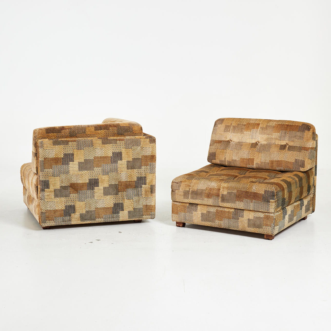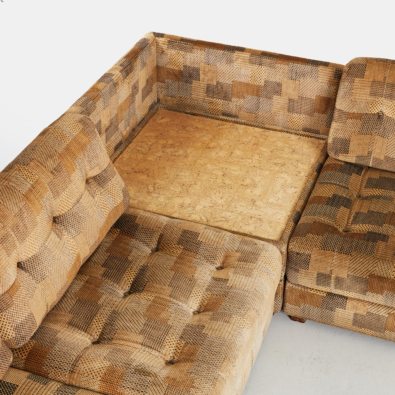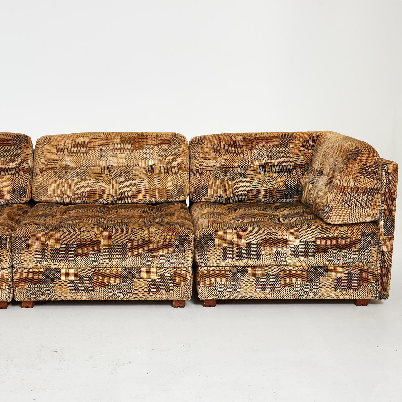 5041056. SOFA, 7 modules, including one side table, 1970s, textile upholstery, loose back cushions.