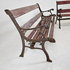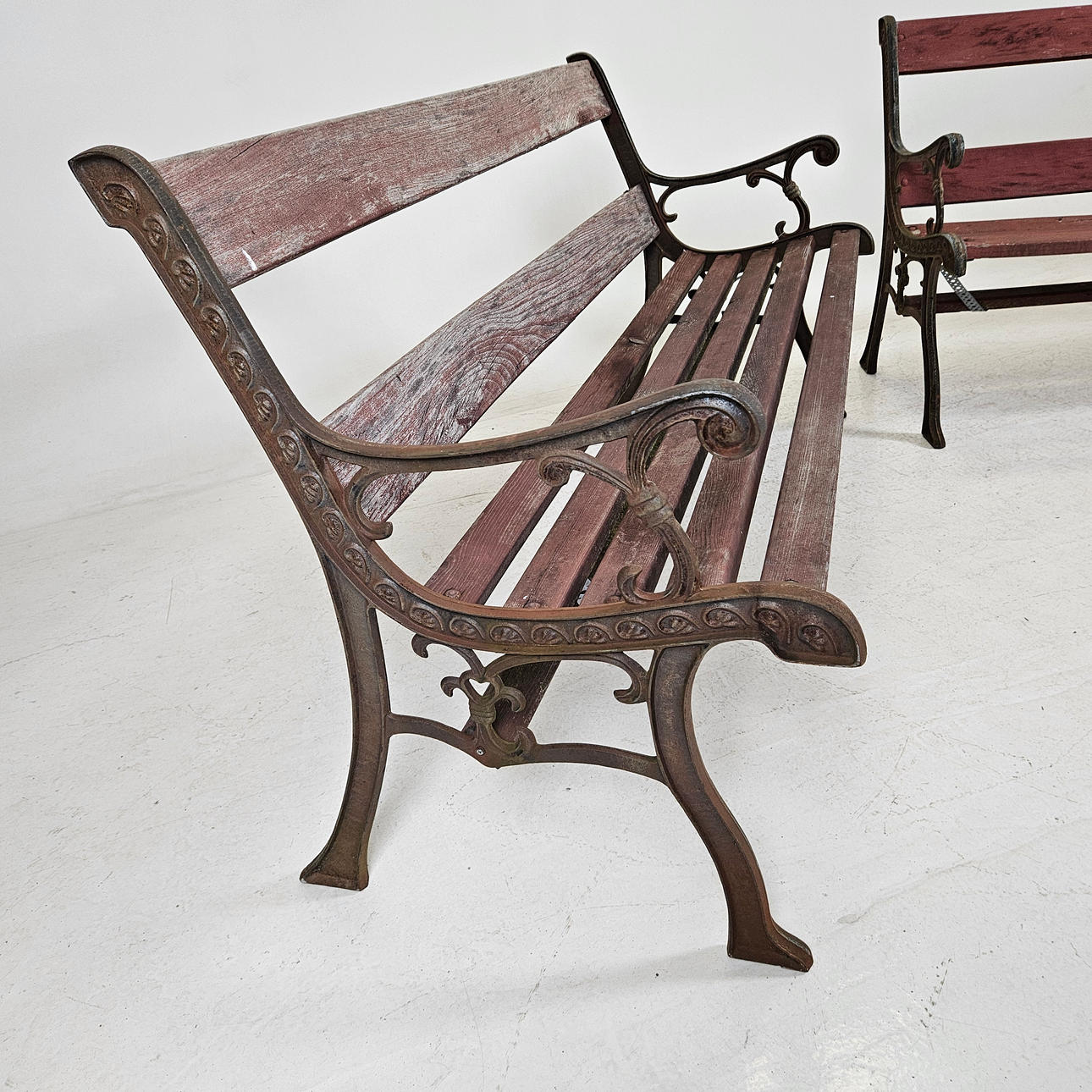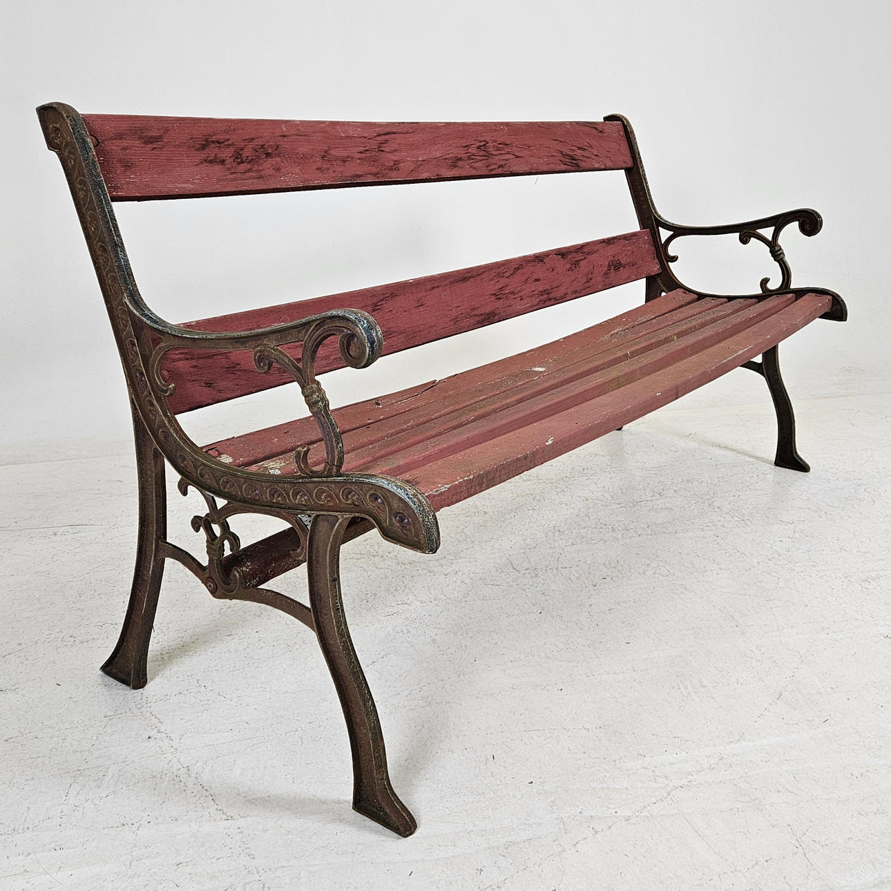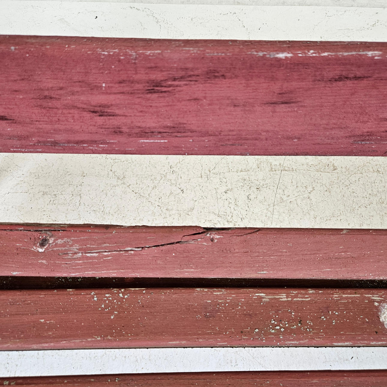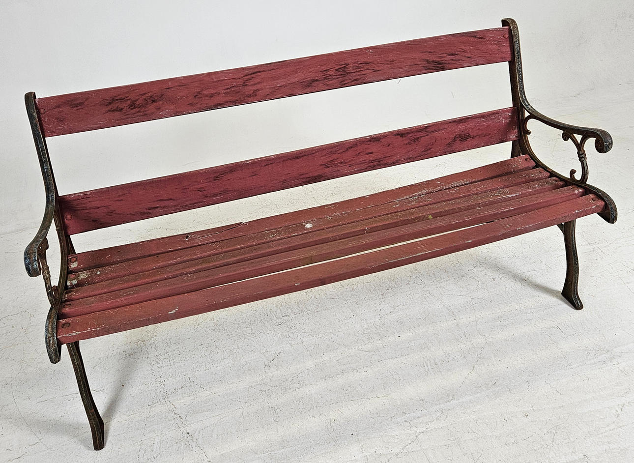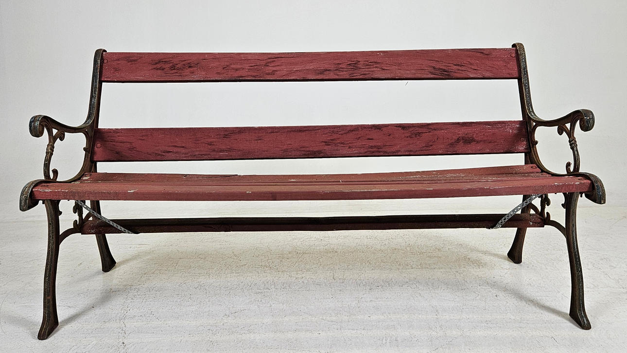 Wear, stains, paint loss, one slat with damage, dry cracks, ends with rust, wobbly. One end with damage.
