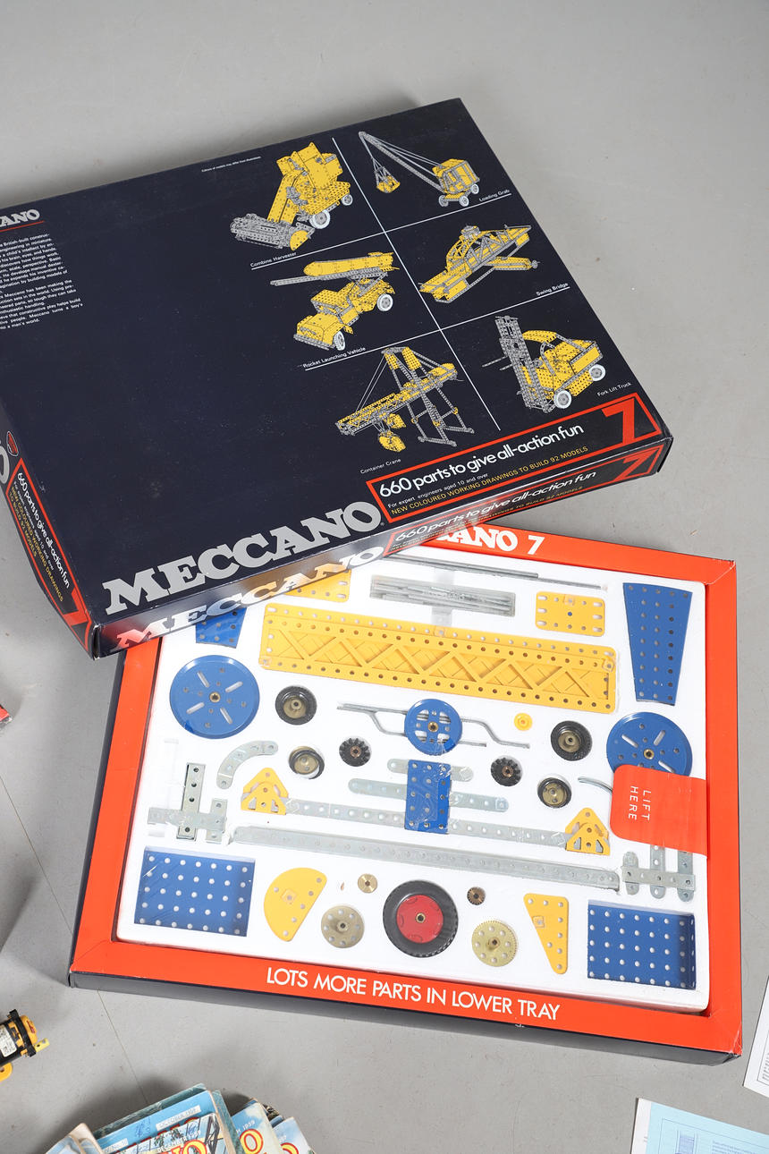 to include a Meccano 3-12 volt D.C. motor and 6-ratio gearbox, Meccano gears set, Meccano mechanisms, Meccano number 7 construction set, together with a collection of meccano magazines and instruction booklets (qty).
