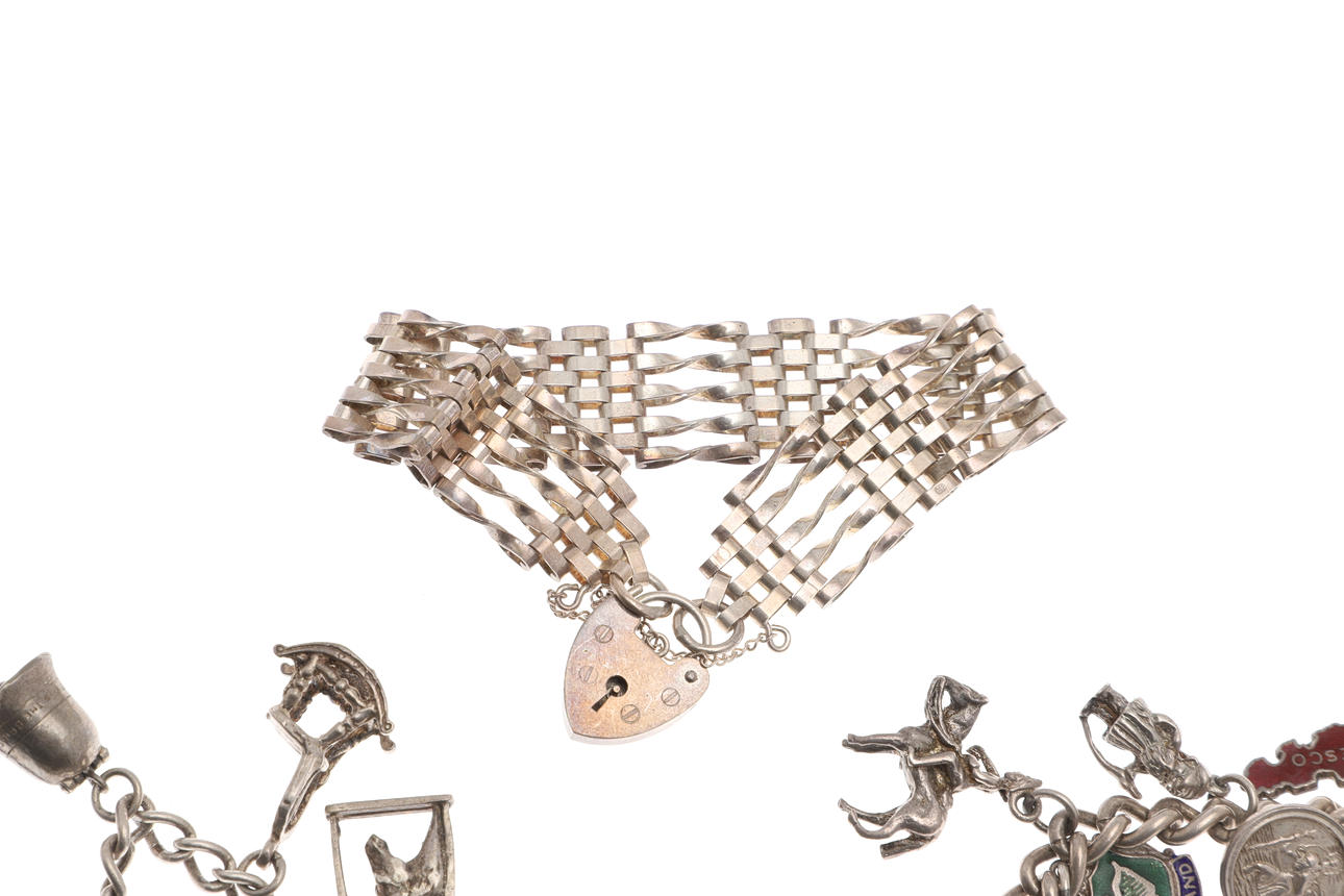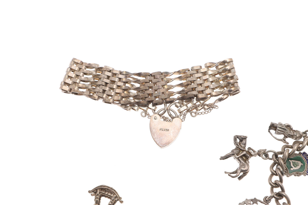 5041318. TWO SILVER BRACELETS WITH ATTACHED CHARMS AND A GATE BRACELET.