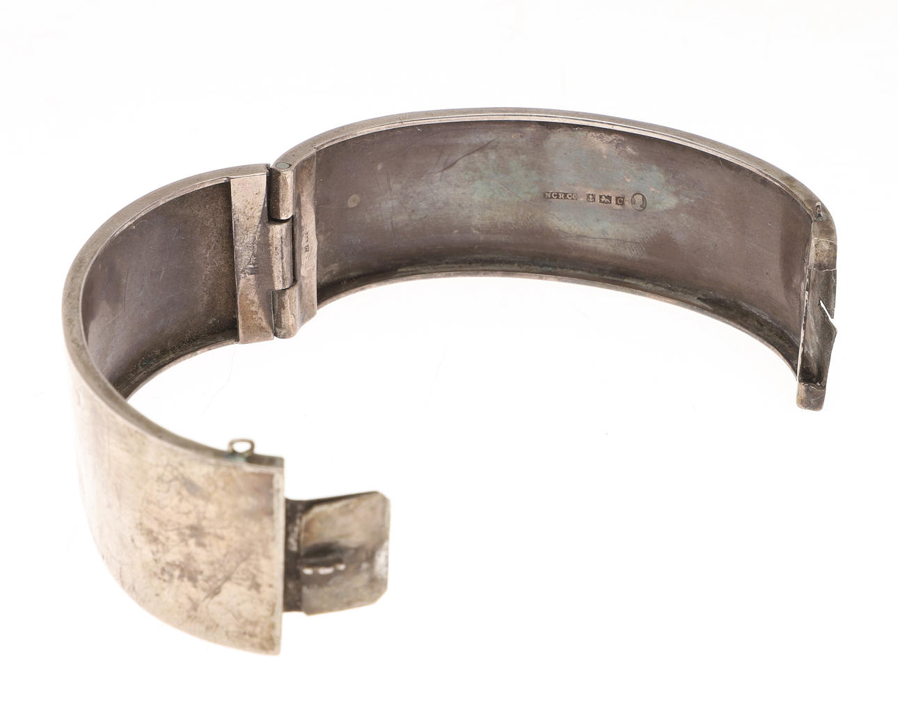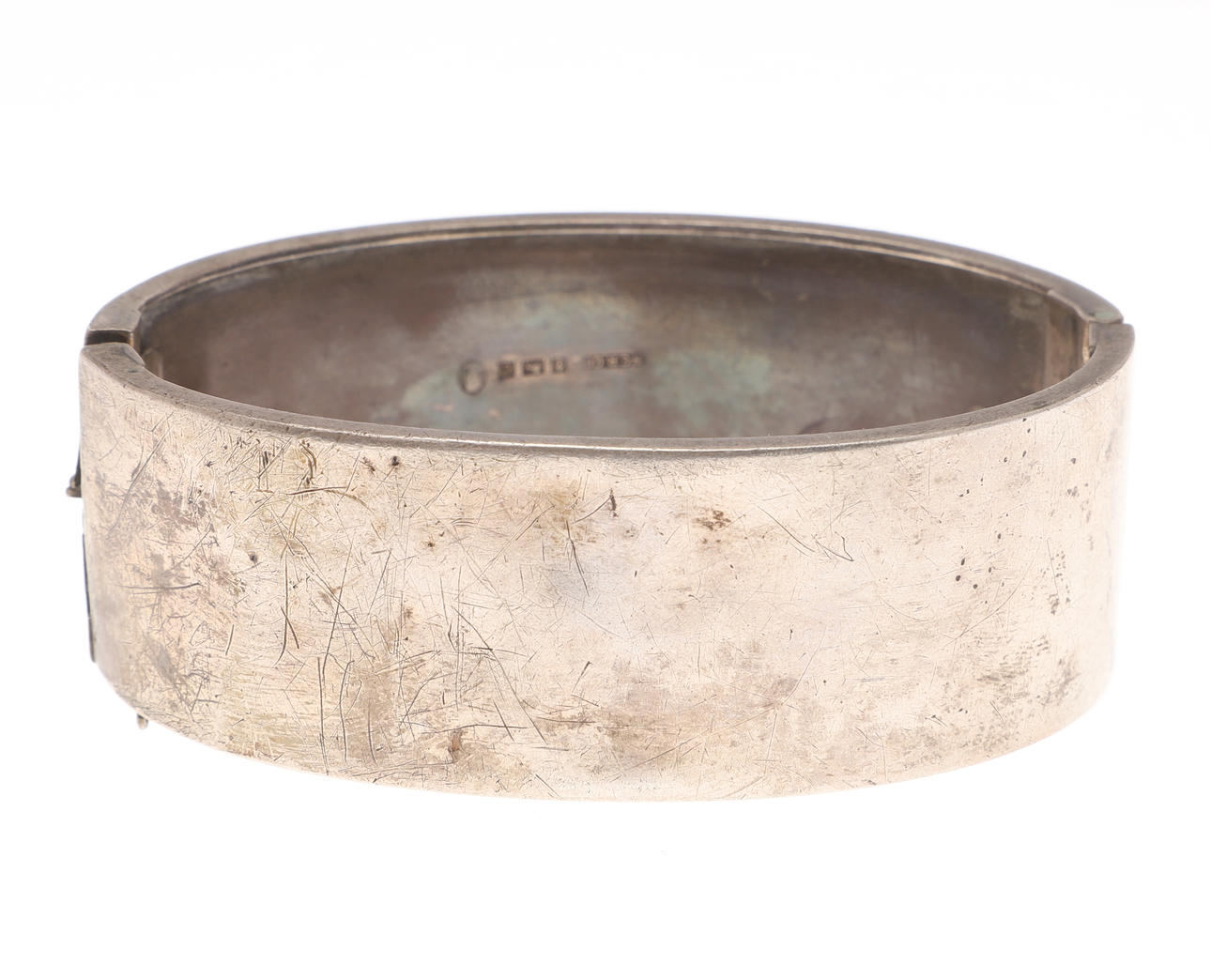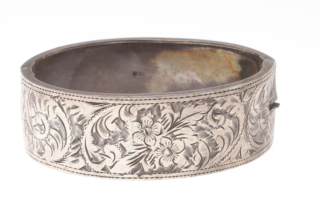 the engraved silver bangle hallmarked Birmingham 1953, 30.9g, together with two early 20th Century 9ct gold and half pearl brooches, 3.2g.