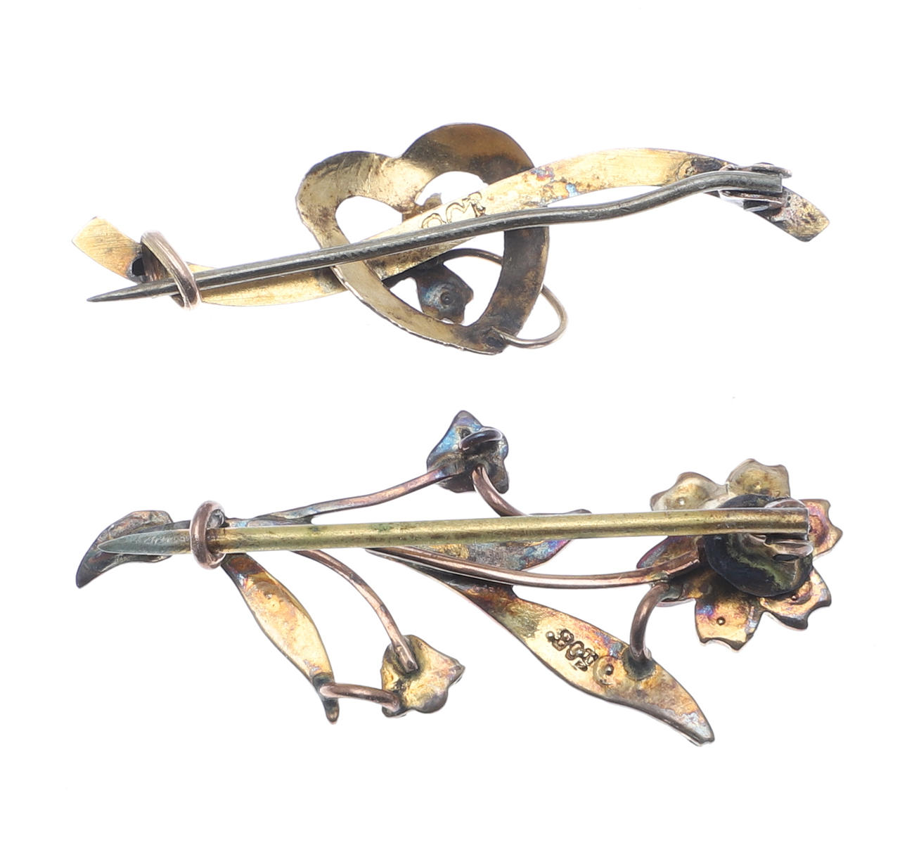 clasp on bangle loose and with some dents on reverse, brooches worn and with pearls missing.