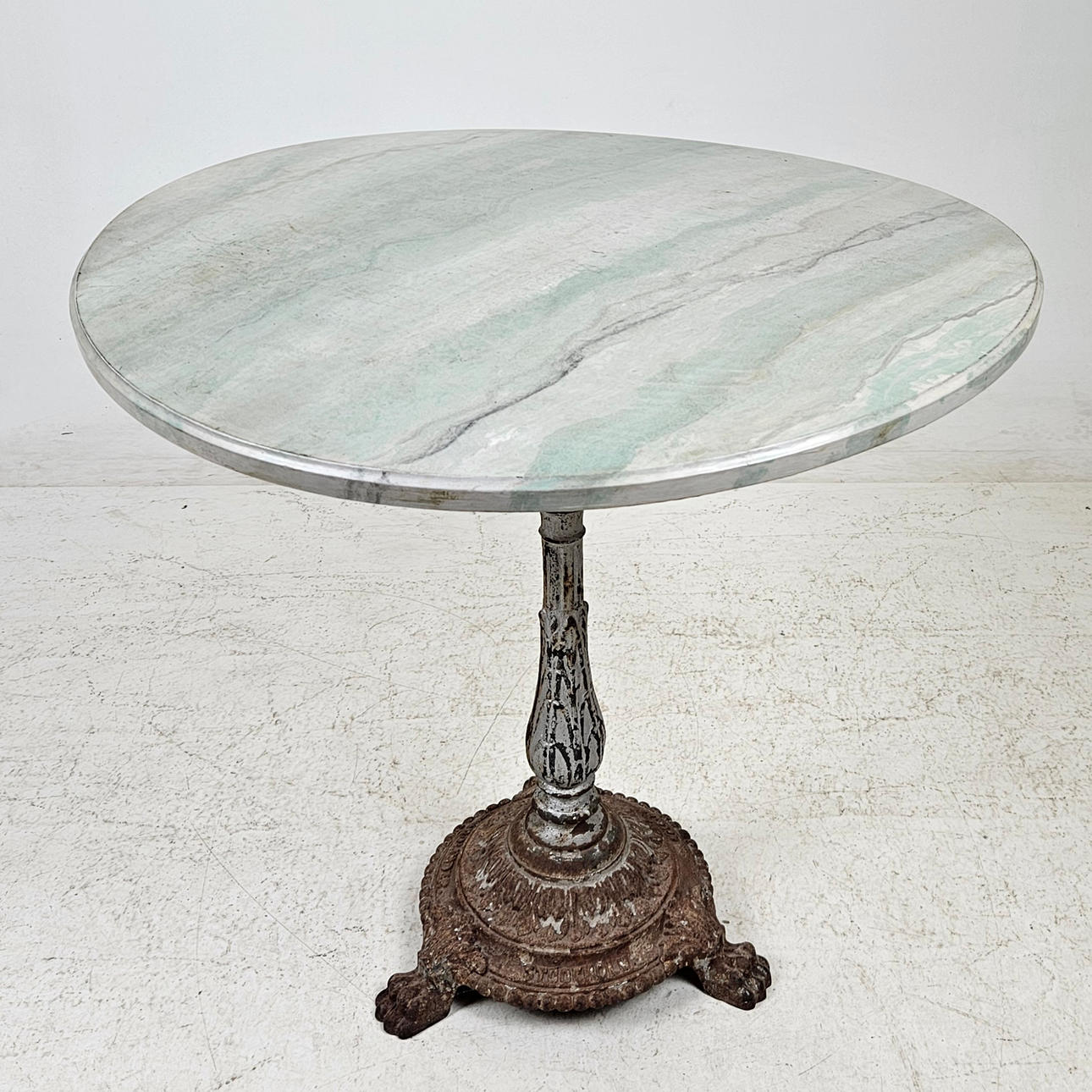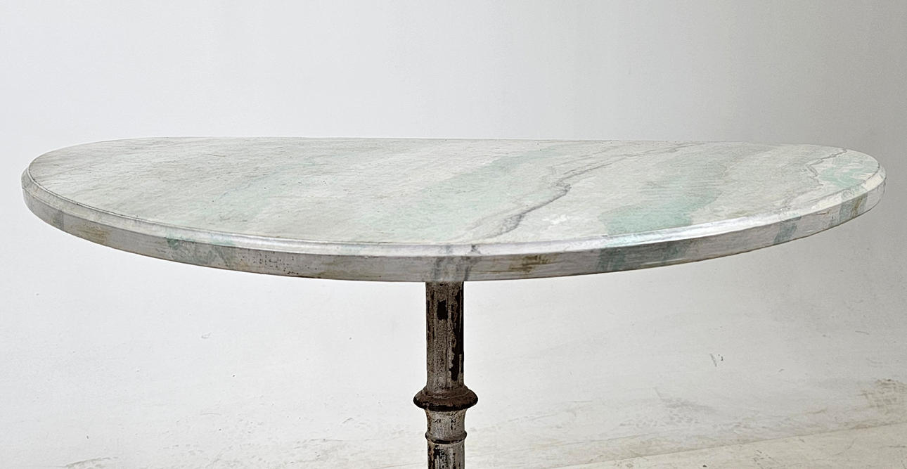 Cast iron base, marbled wooden top, marked. Diameter approx. 70, height 72 cm.