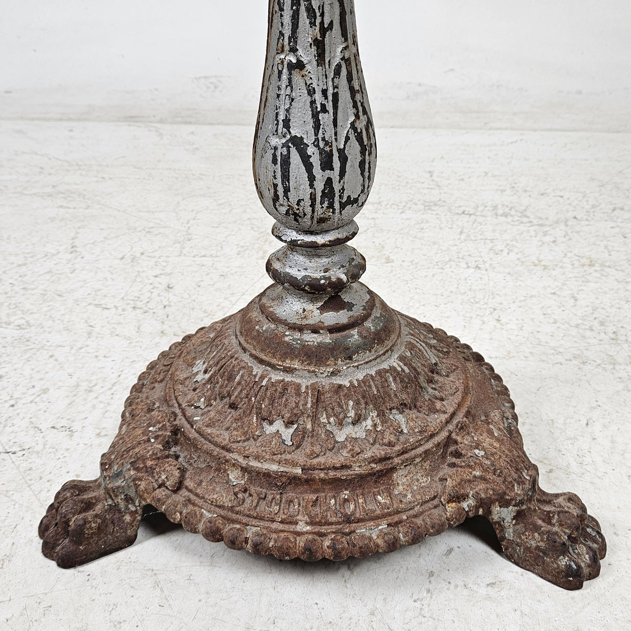 Uneven later top. Base, wear, paint loss, rust.