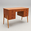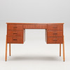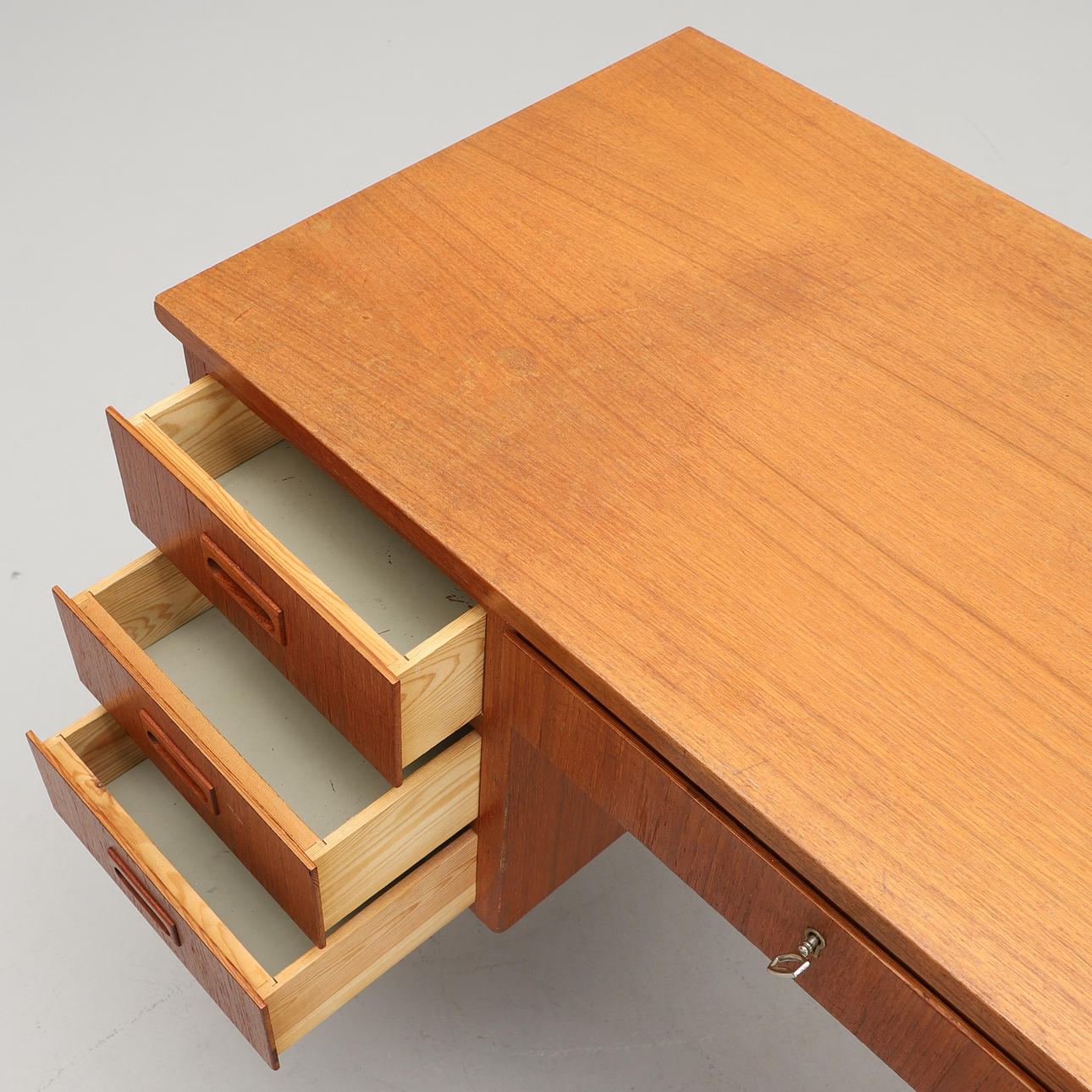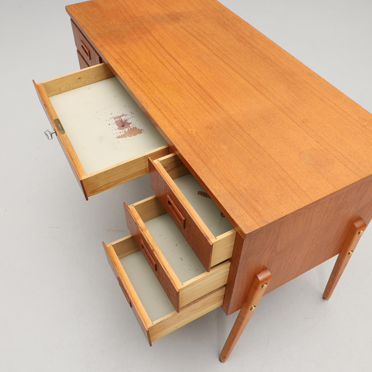 Teak veneer. Beech legs. Rectangular top, two pedestals with three drawers each, drawer in the apron. Length 114, depth 50, height 73 cm.