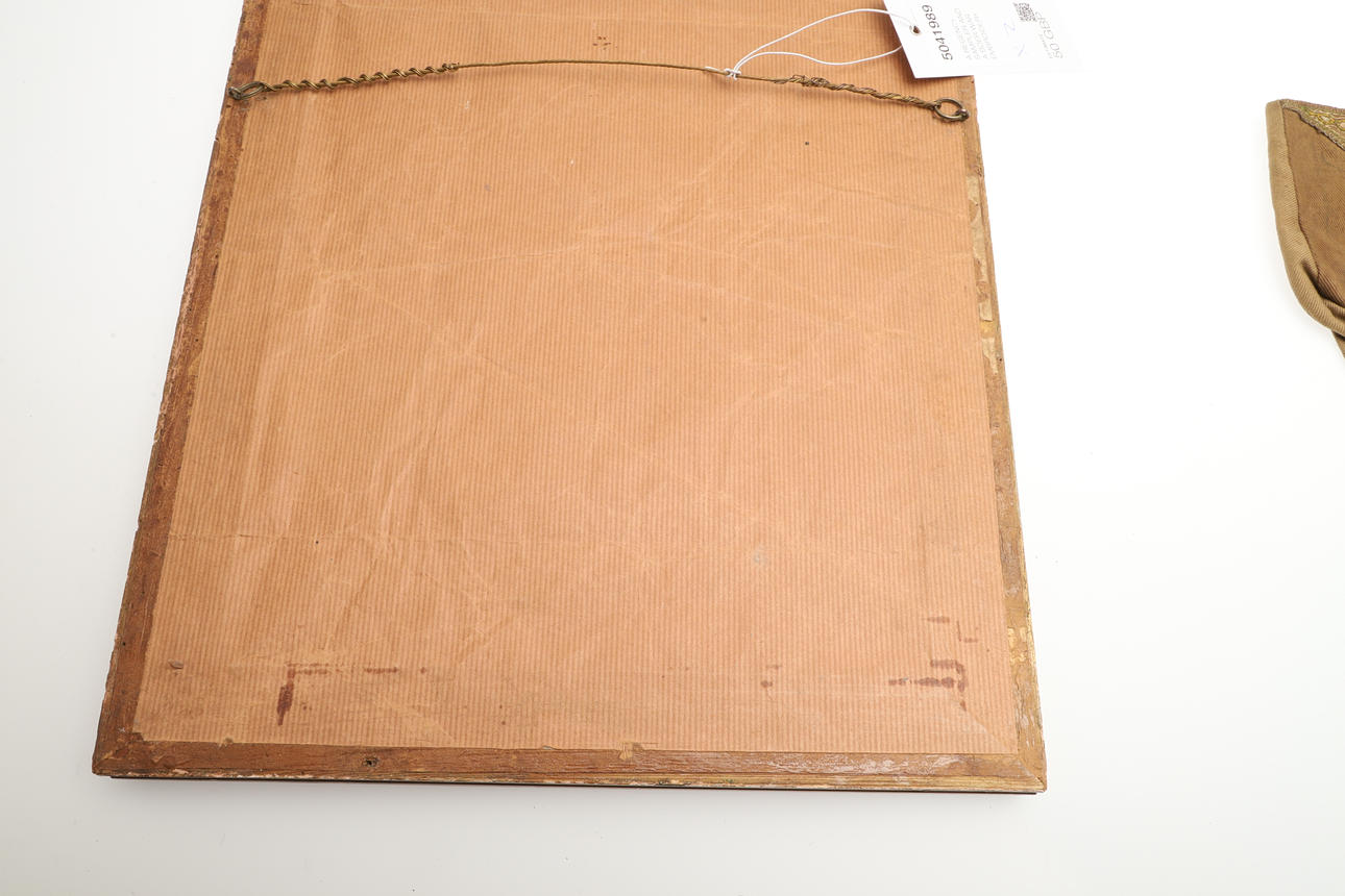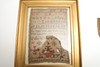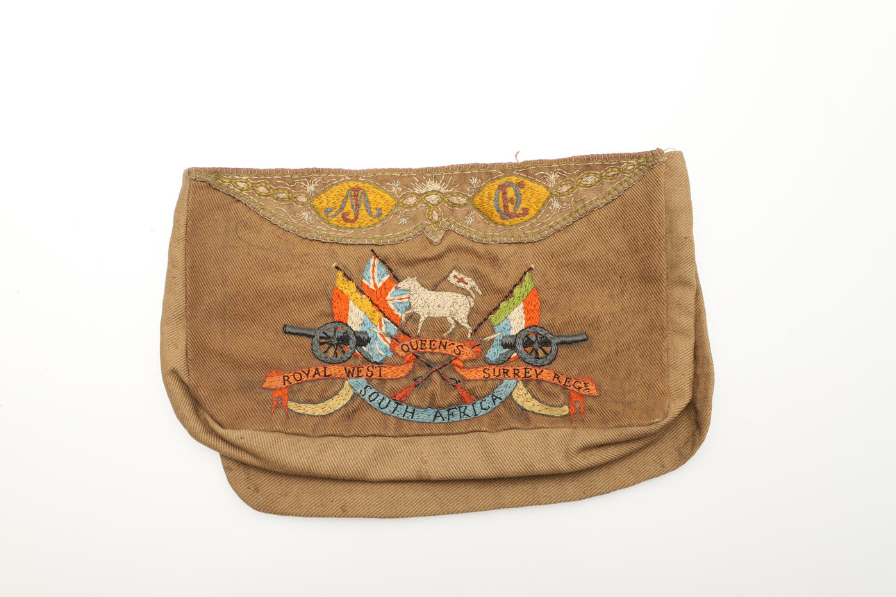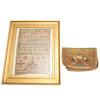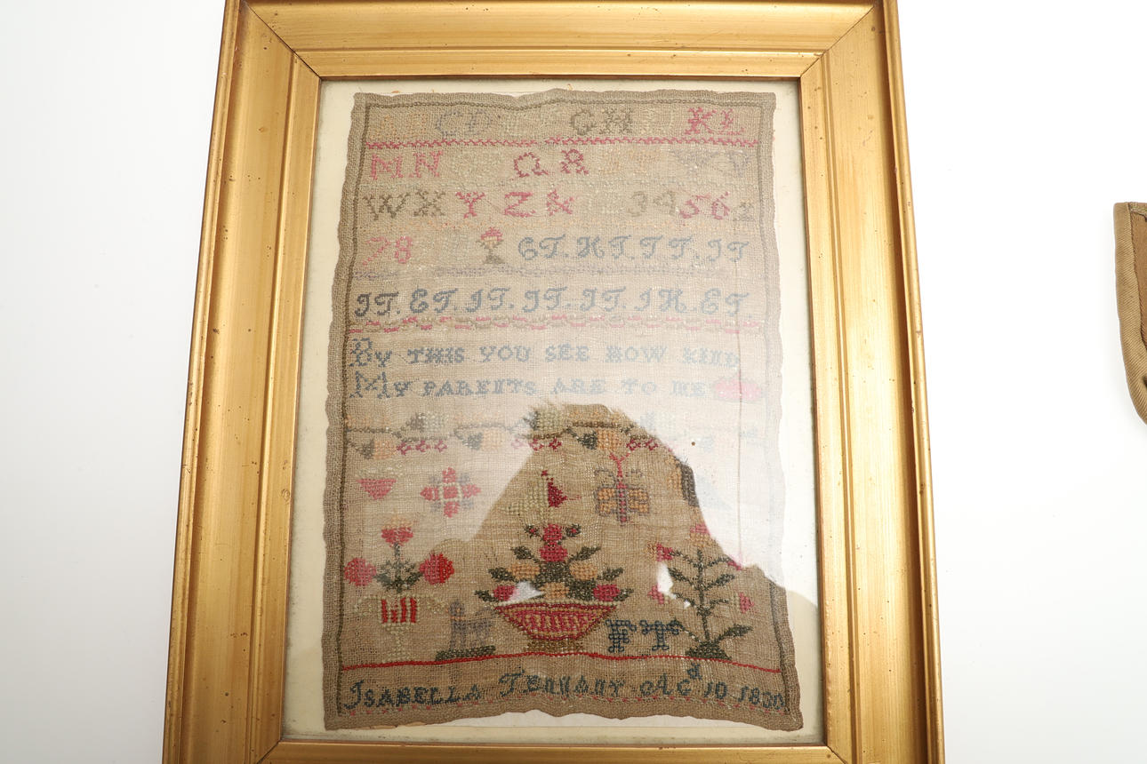 illustrating four bands of alphabets and numbers above a central basket of flowers surrounded by animals, by Isabella 1830, in later glazed frame, 34cm x 42cm overall, together with a Boer War period embroidered with coat of arms for the Queen's Royal West Surrey Regiment, 22cm x 15cm (2).