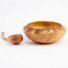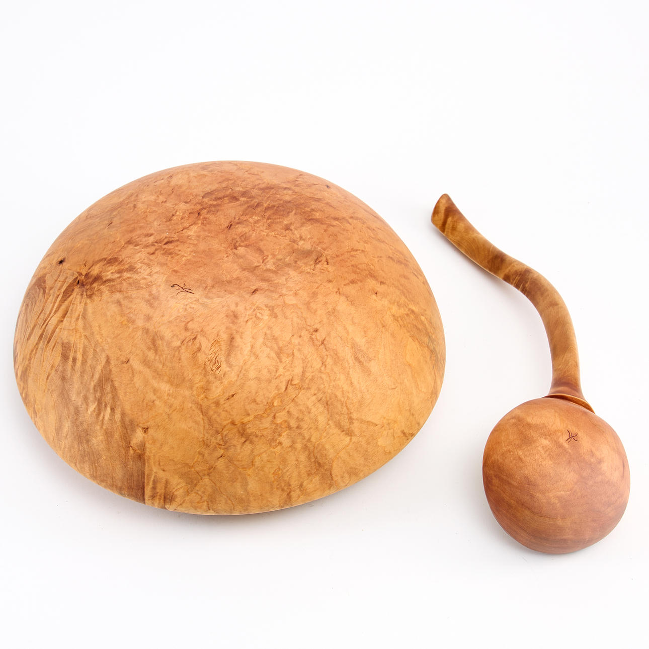 Birch burl with bone inlay, Ø 31 cm, spoon L 34 cm.