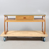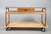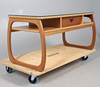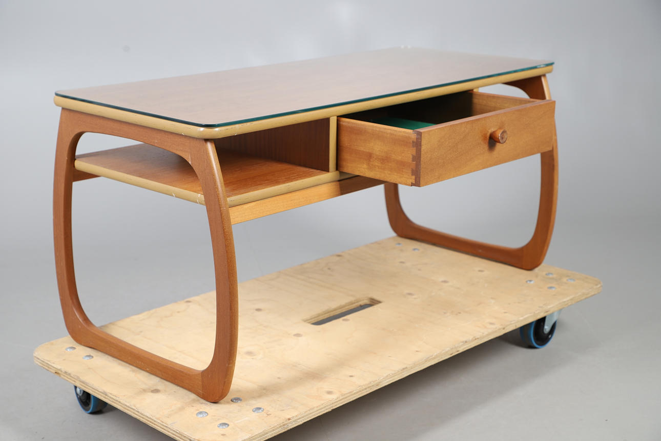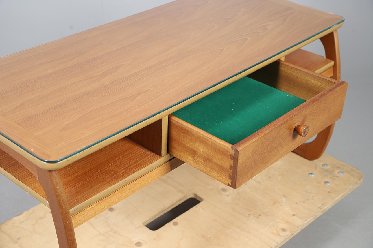 A coffee table with a rectangular shaped top, with a drawer which opens on both sides and supported on a curved legs. With a glass top. 106cms by 45cms, 51cms high.