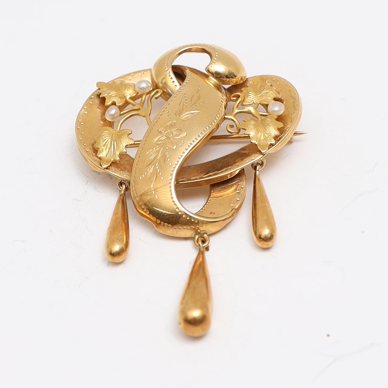 With engraved and openwork decoration. Teardrop-shaped ornaments and set pearls.