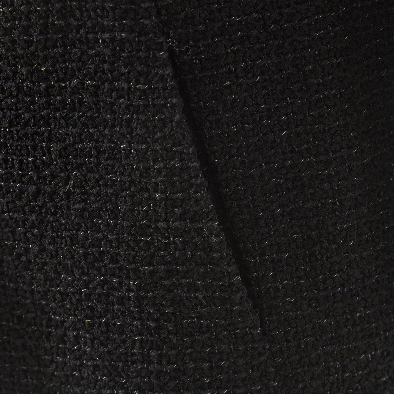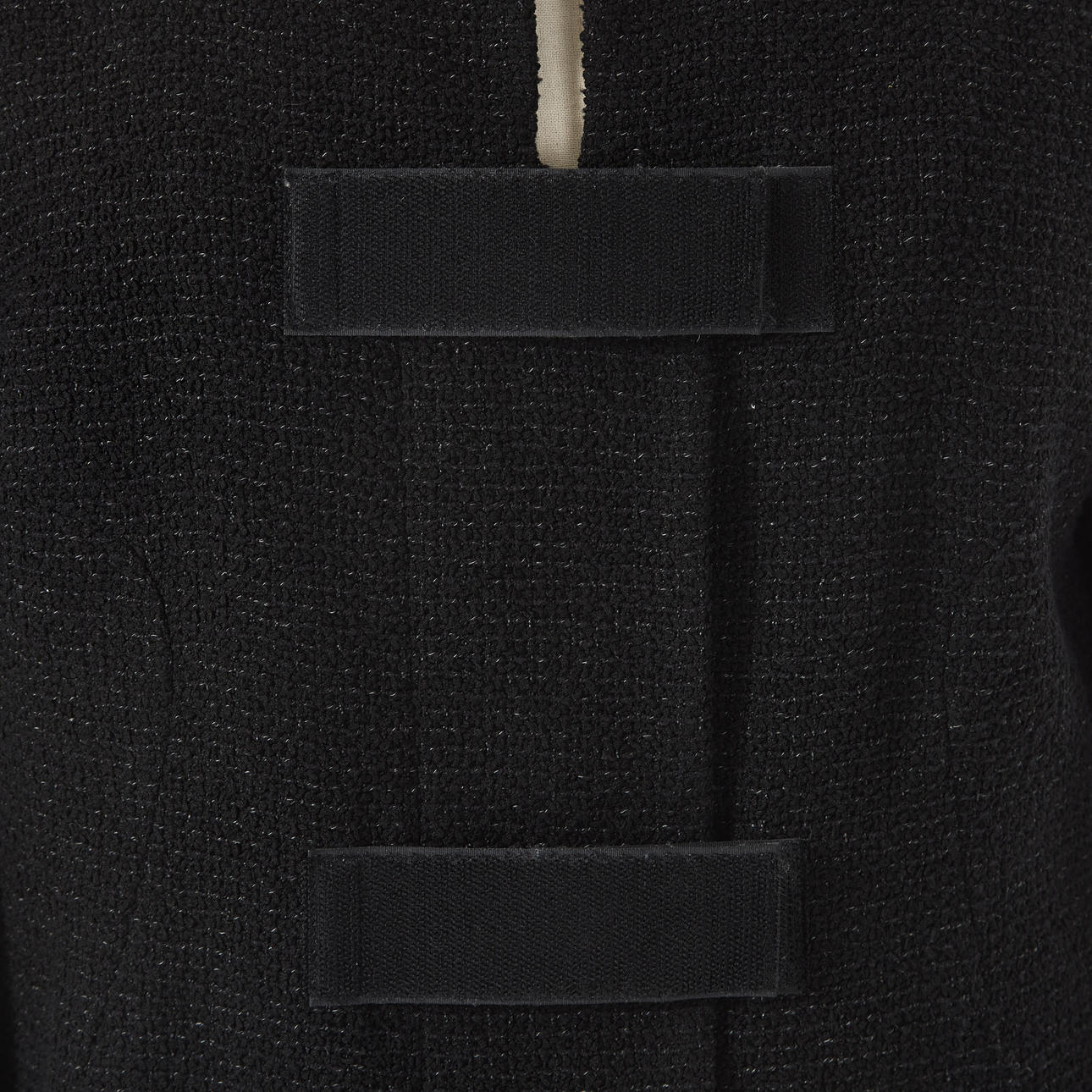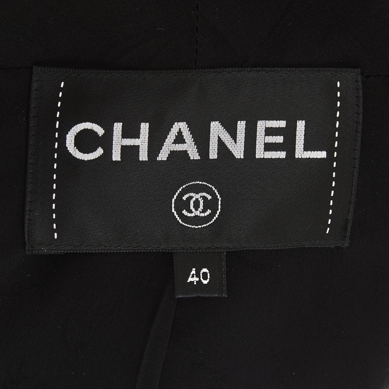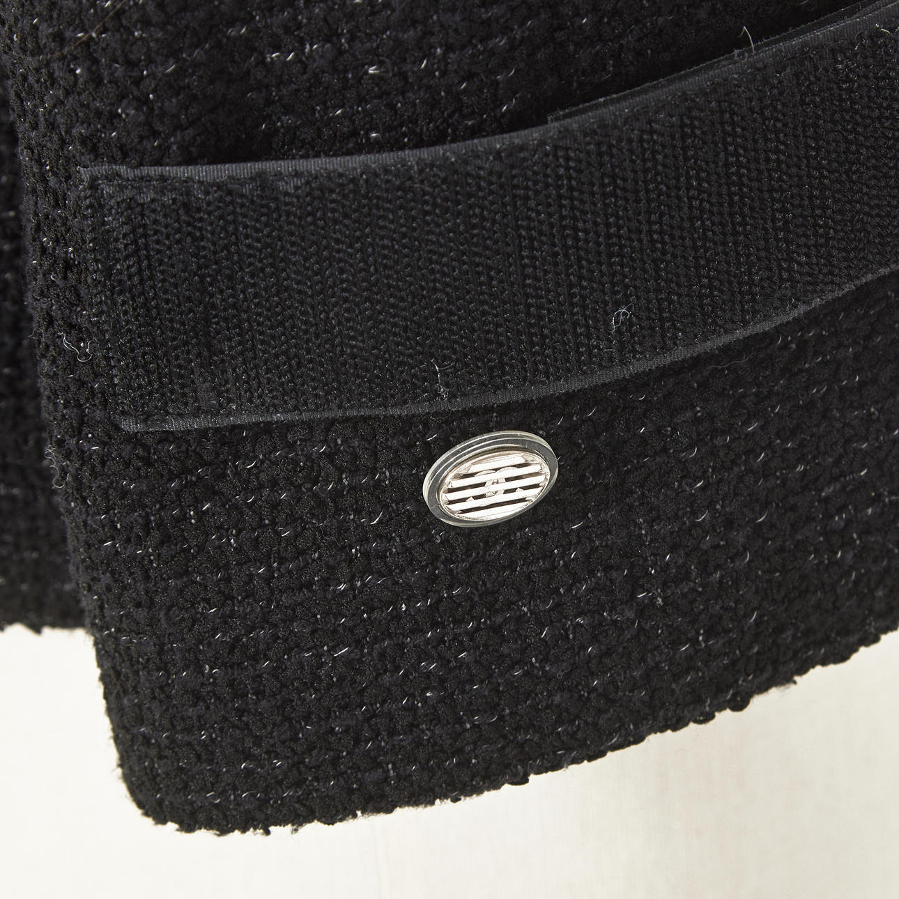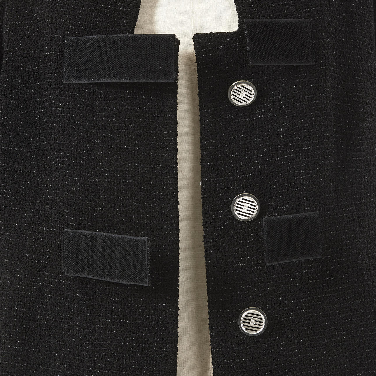 Black tweed, rounded shoulders, concealed silver-tone CC buttons at the front, velcro fastenings, one cuff with button, lined in patterned black silk, marked "Chanel", size FR40, sleeve length approx. 44 cm, back length 54 cm, bust measurement measured flat approx. 48 cm.