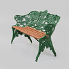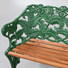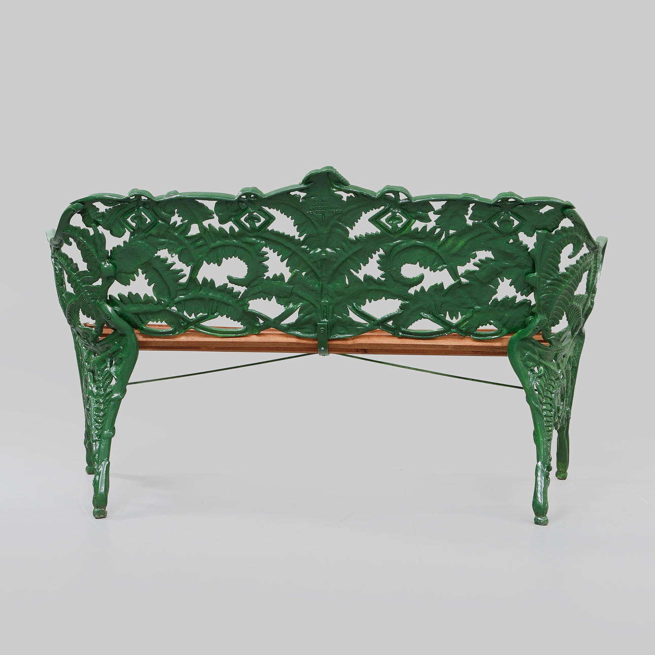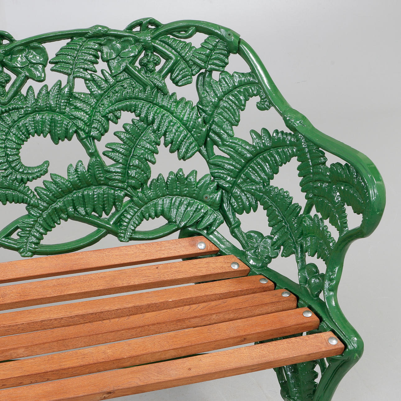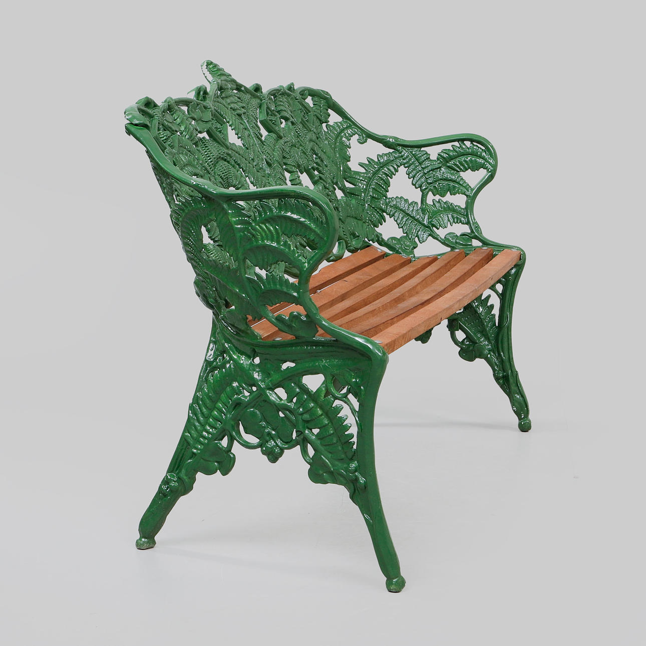 Green-painted aluminium with teak slats. Length approx. 149 cm, seat height approx. 43 cm, back height approx. 88 cm.