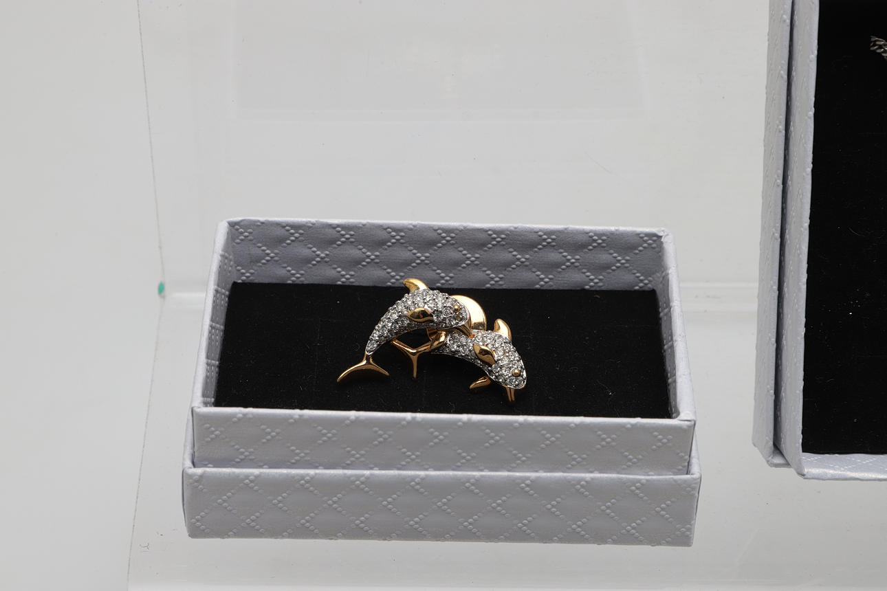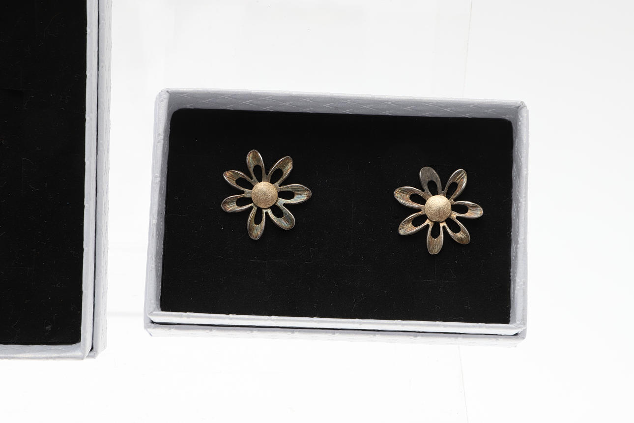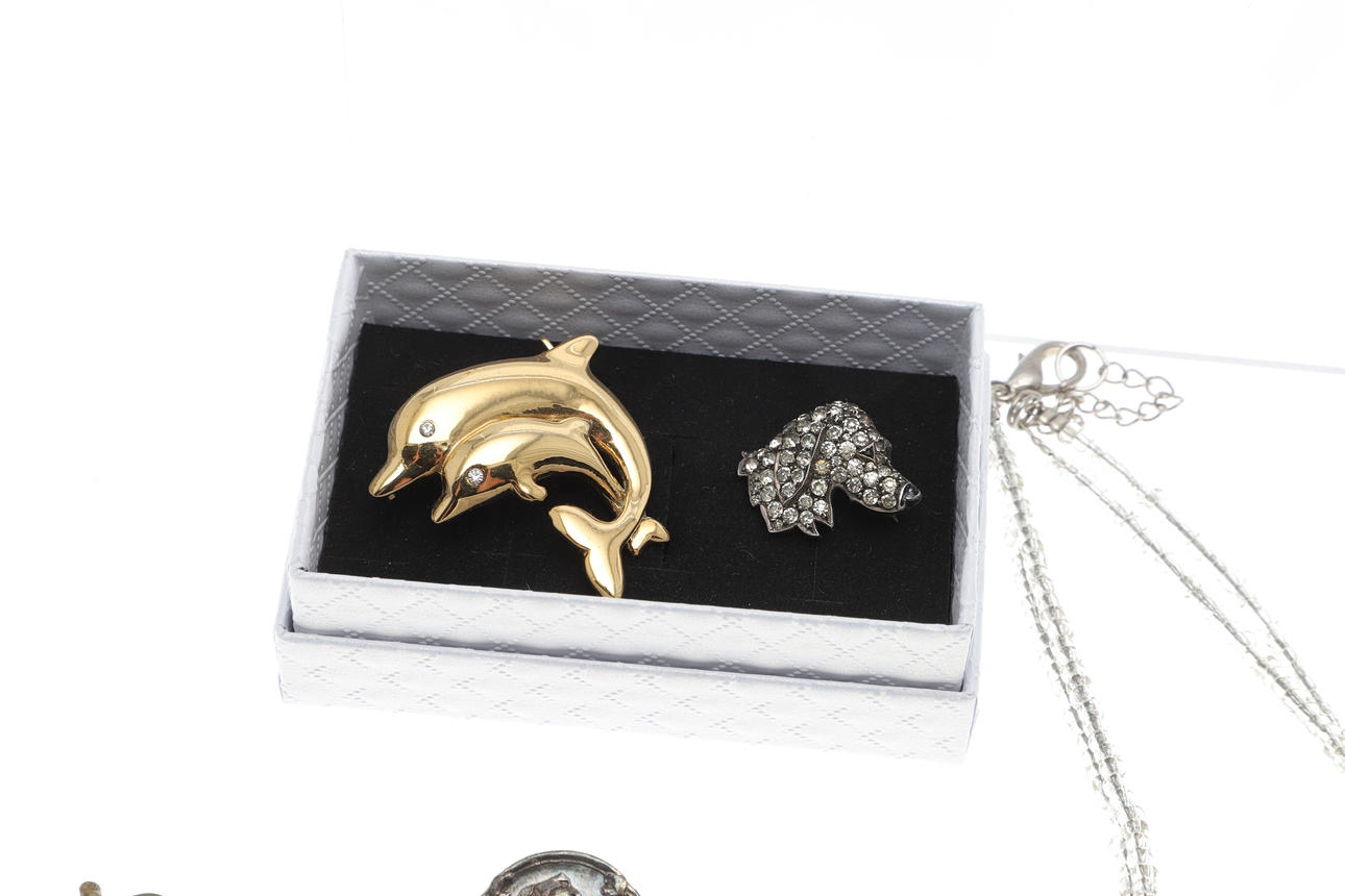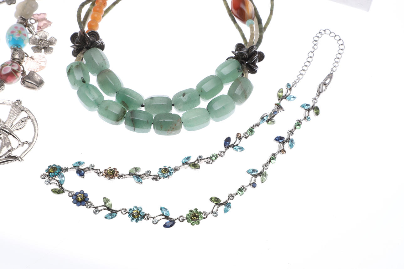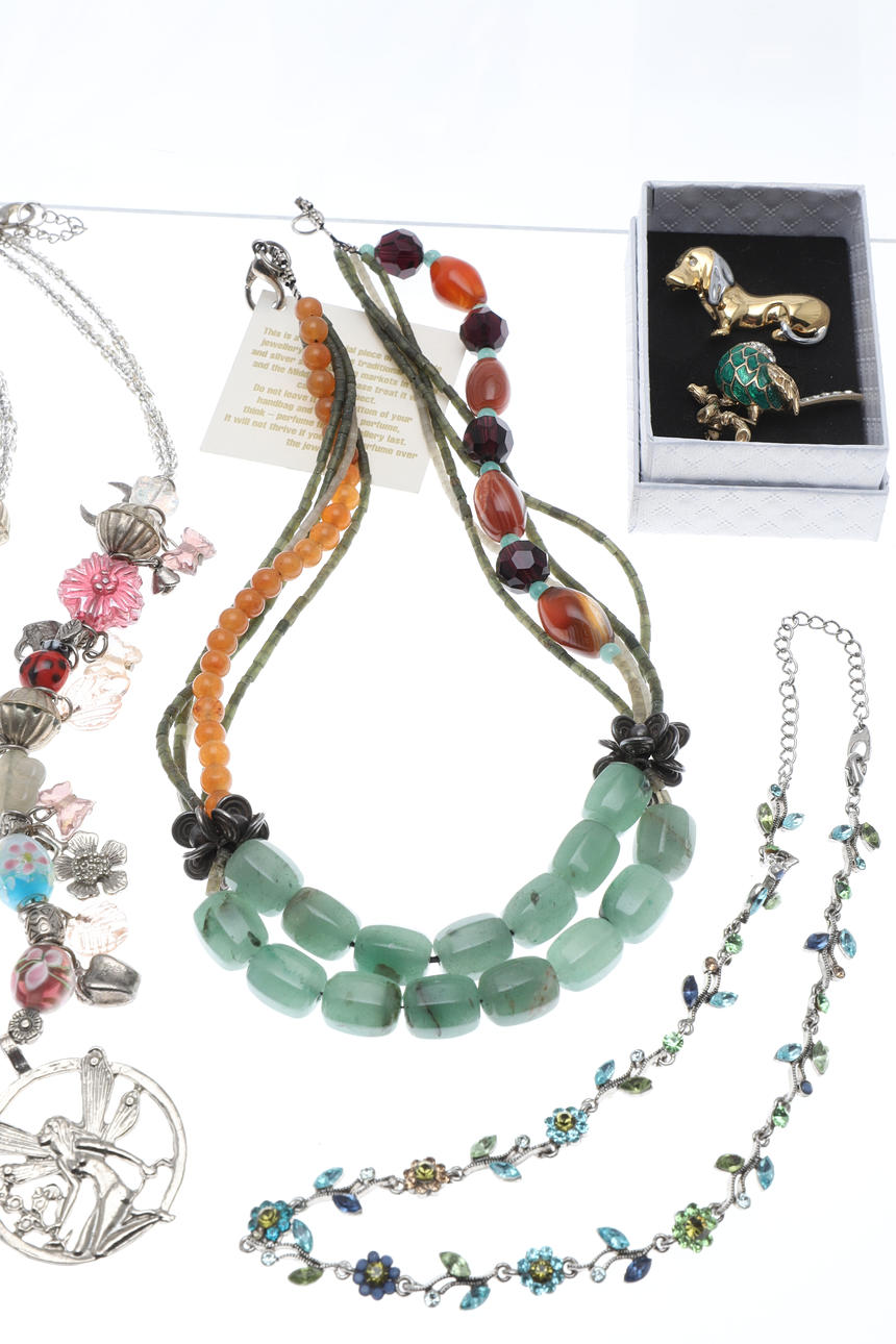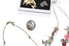 silver and gold flowerhead earrings, a silver and paste dog brooch, a hardstone necklace and items of costume jewellery etc.