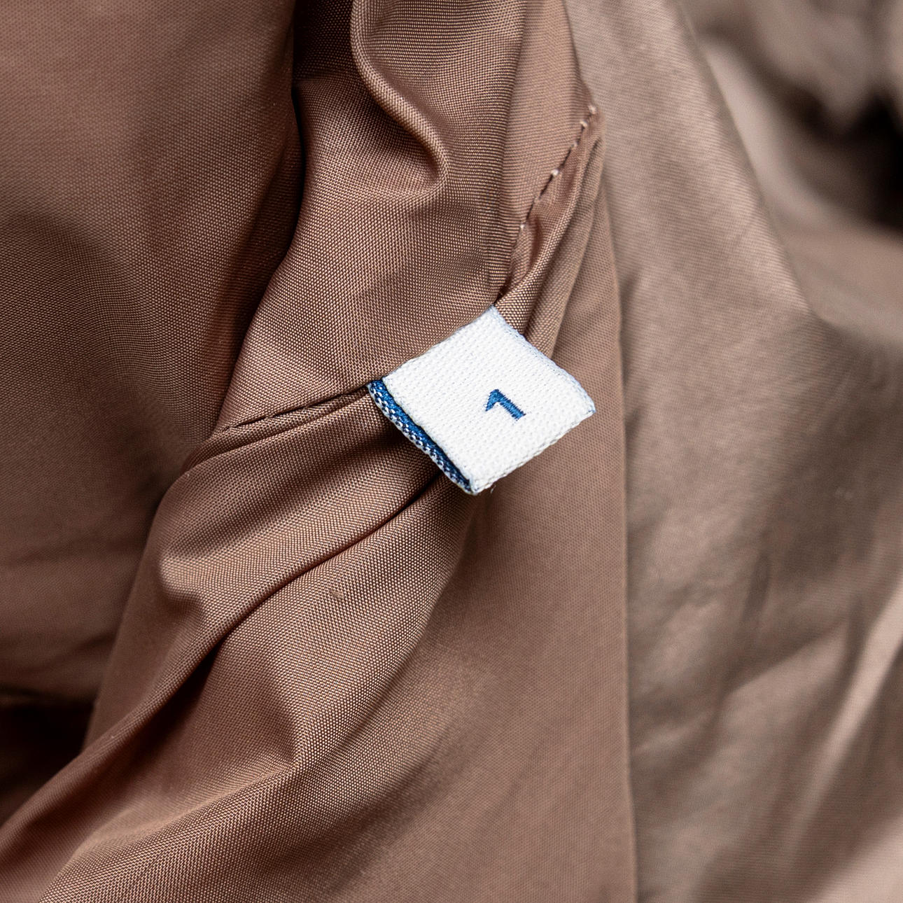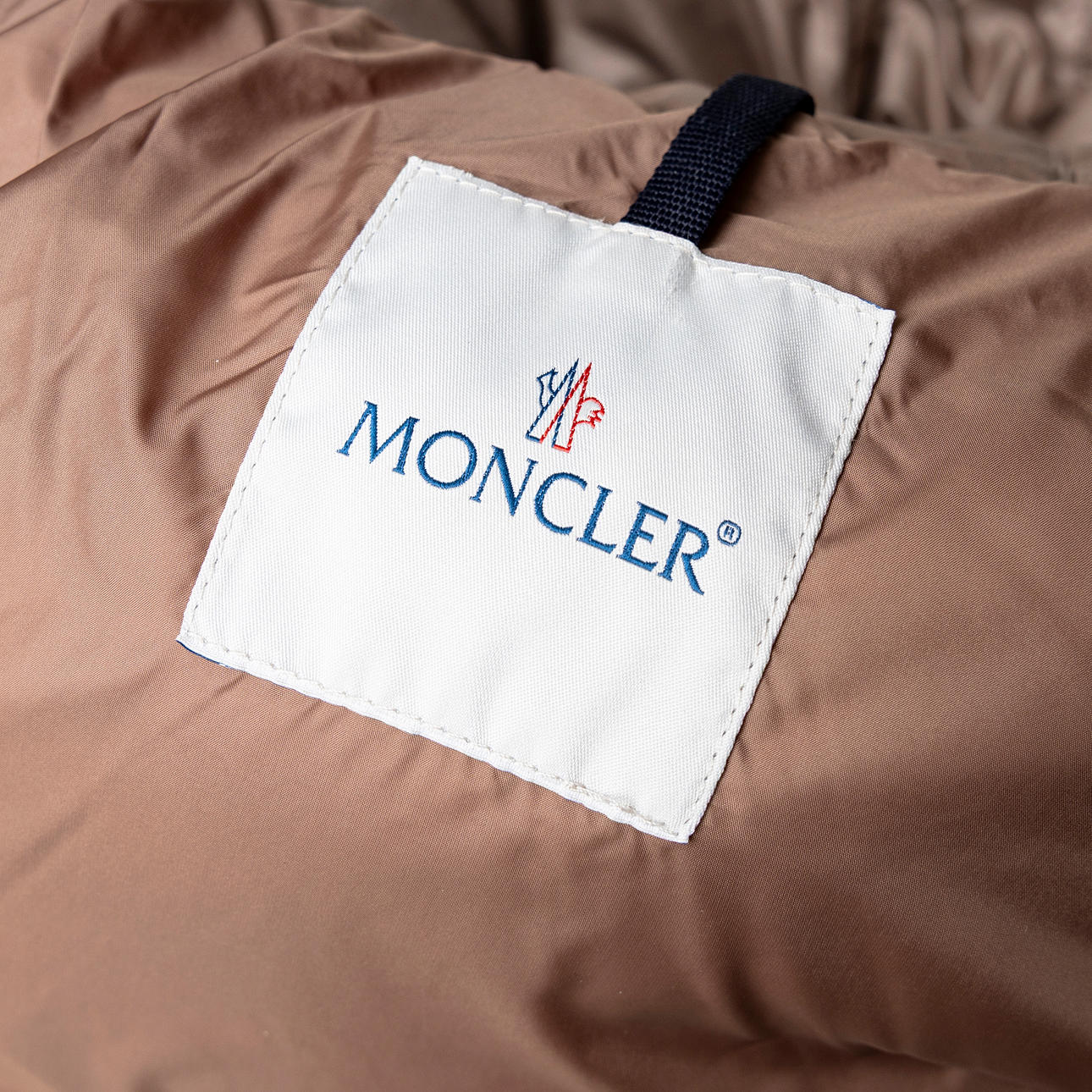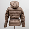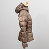 Dark beige synthetic fabric, fitted model with hood, zipper and belt at the waist. Two hidden side pockets. Labeled "MONCLER"., according to label size 1 (corresponds to approx. size small 36).