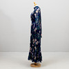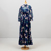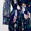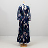 Floral silk chiffon with a dark blue background, long-sleeved with ruffles, partially open back with a bow. Dark blue slip dress, concealed zipper in the back.