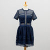 Dark blue lace dress with matching slip. Short-sleeved with a defined waist, gold-coloured zipper at the back. Labelled "BY MALINA COLLECTION". According to label size S.