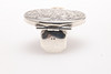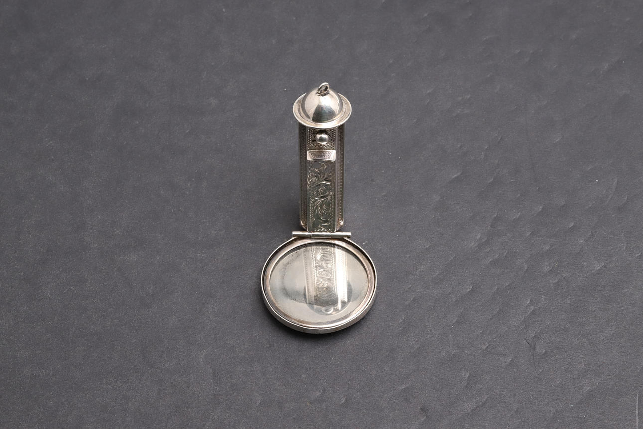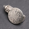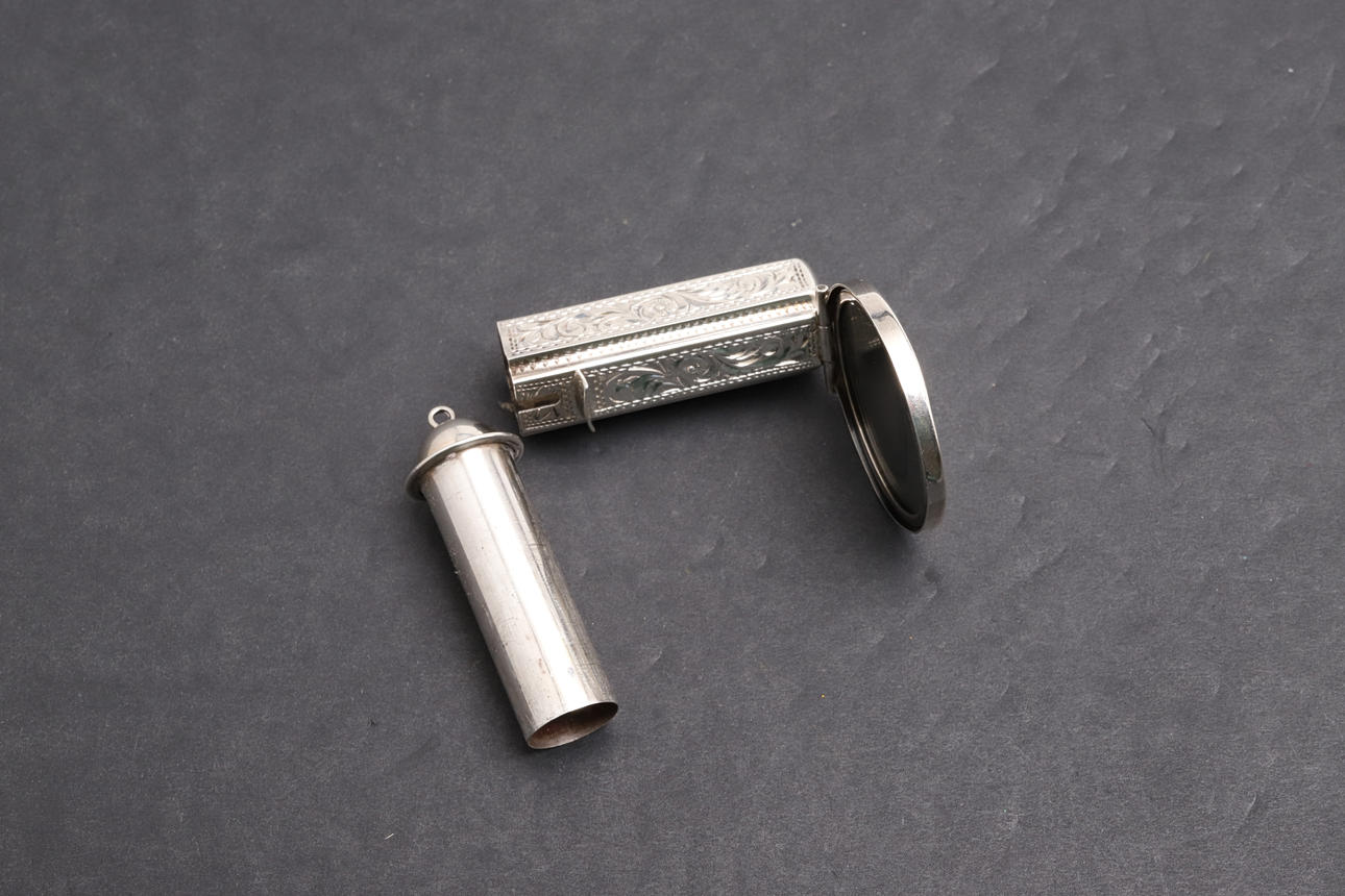 With engraved decoration, removable lipstick holder and folding circular mirror. Hallmarked MV 925. Laid flat (with closed mirror) 5.5cm, weight 26.33g.
