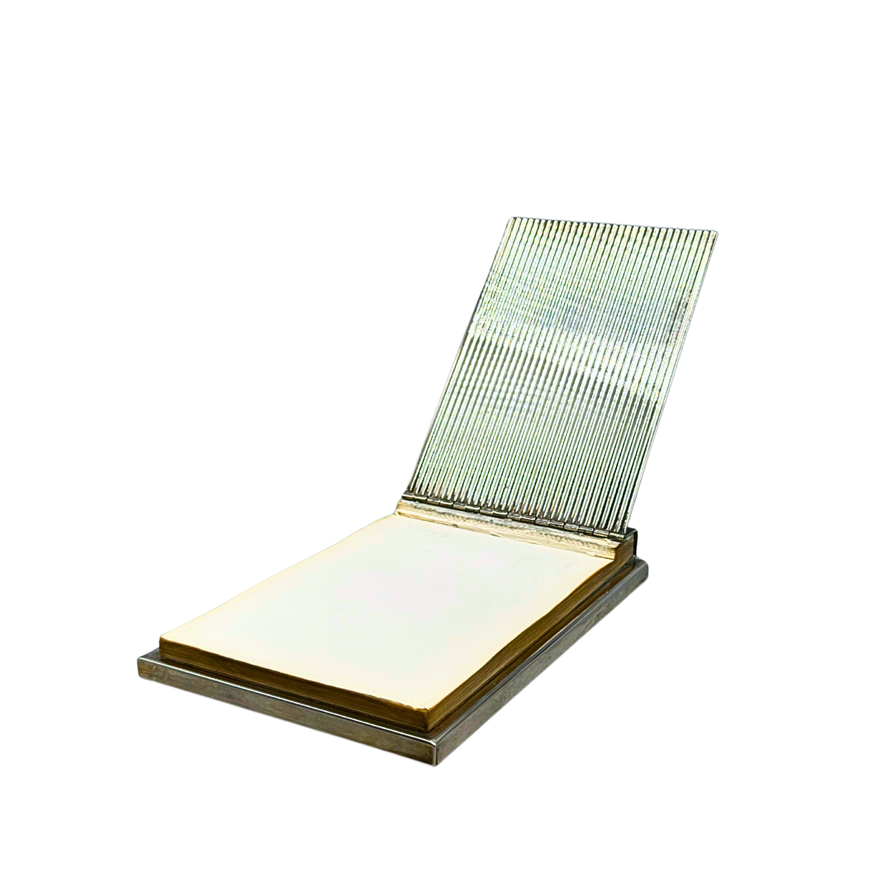 A silver-plated memo pad holder with memo pad.