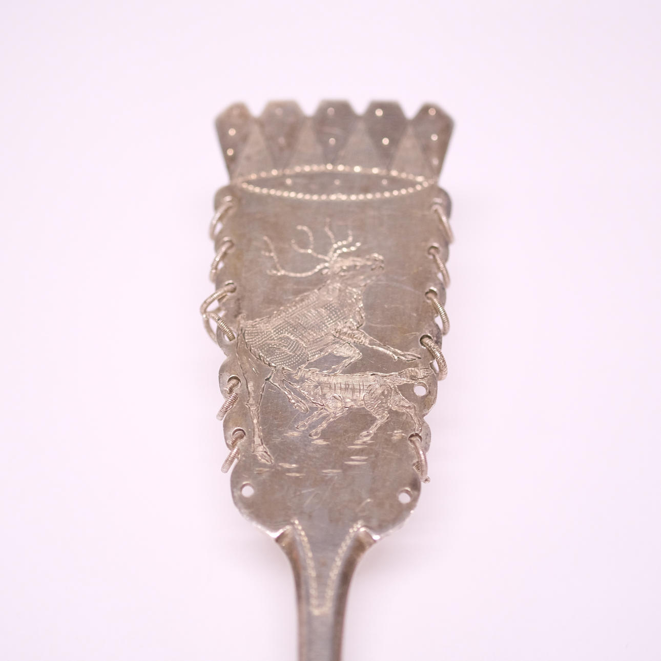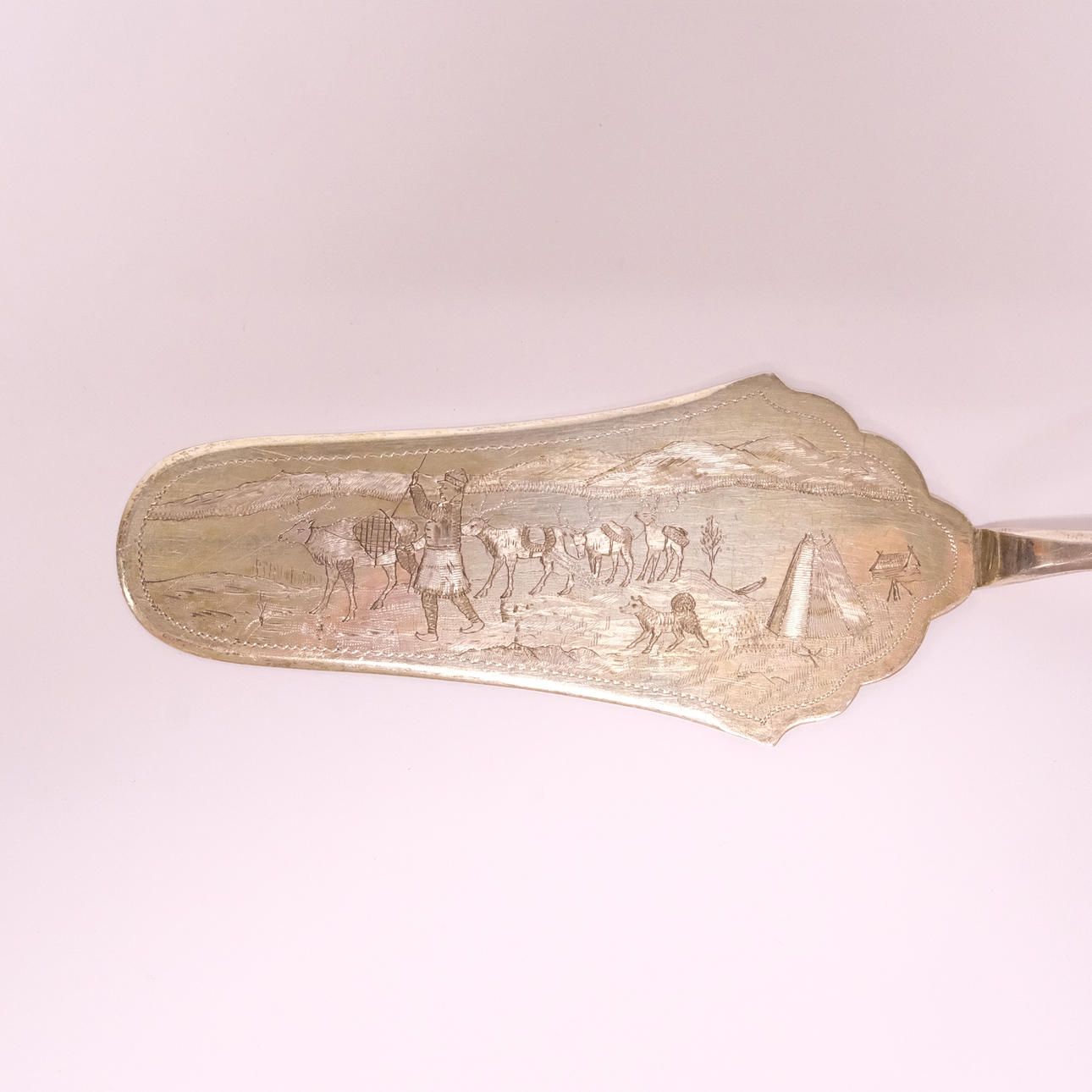 Eric Lindbäck, Nederkalix, 1938, cake slice with motifs including Sami people and reindeer, length 22.5 cm.