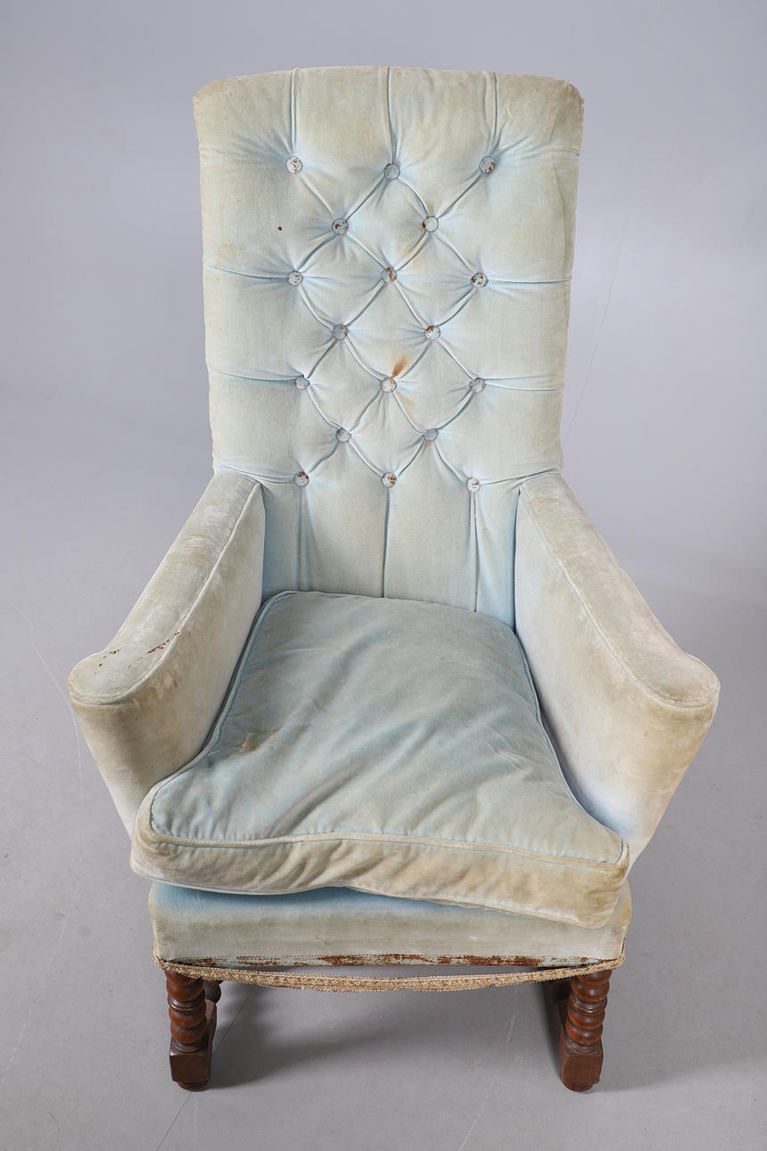 VICTORIAN BUTTON BACK ARMCHAIR.
