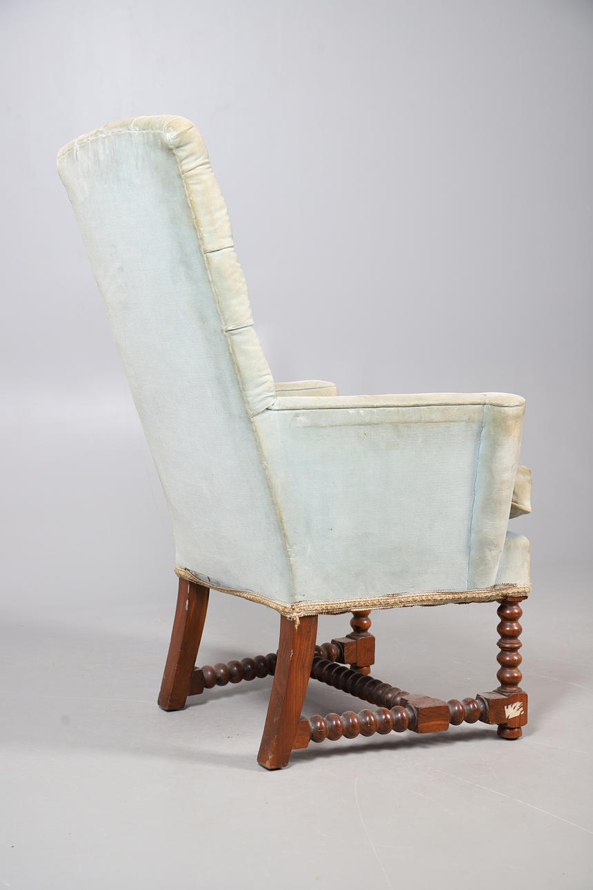 A velvet covered button back armchair with bobbin turnd legs and cross stretcher. 100.5cms high, arms 66cms across at widest point.