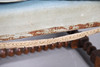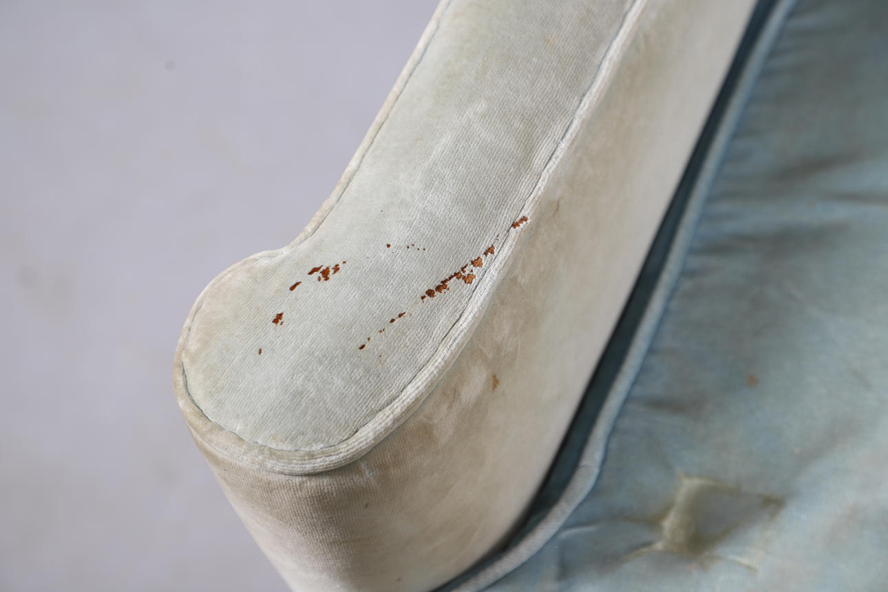 upholstery has faded with some stains and needs re covering, legs with small chips in places and some wear.