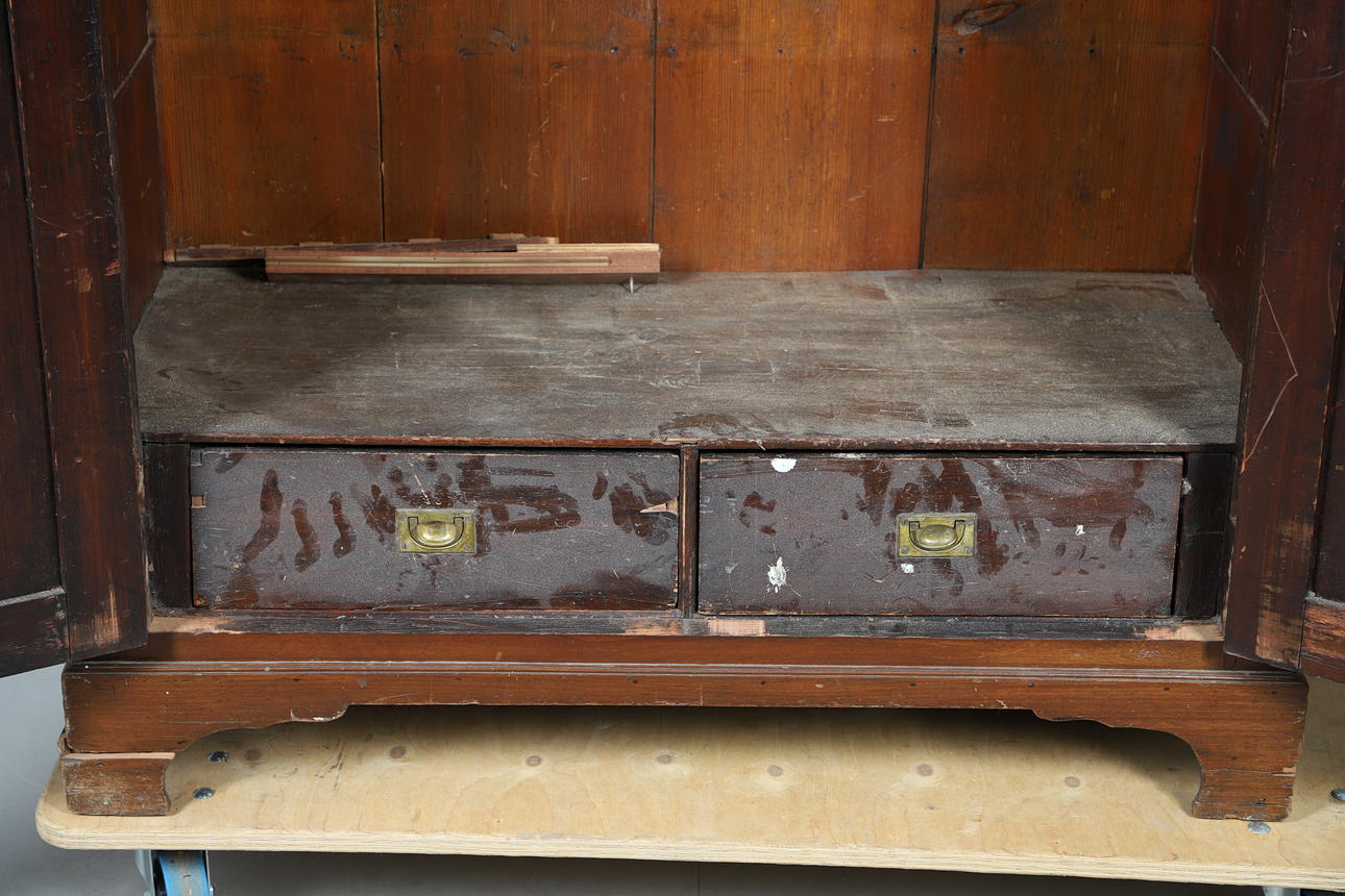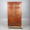 A large walnut two door panelled wardrobe, with hanging space and two internal drawers to the base. 188cms high, top 110cms across.