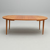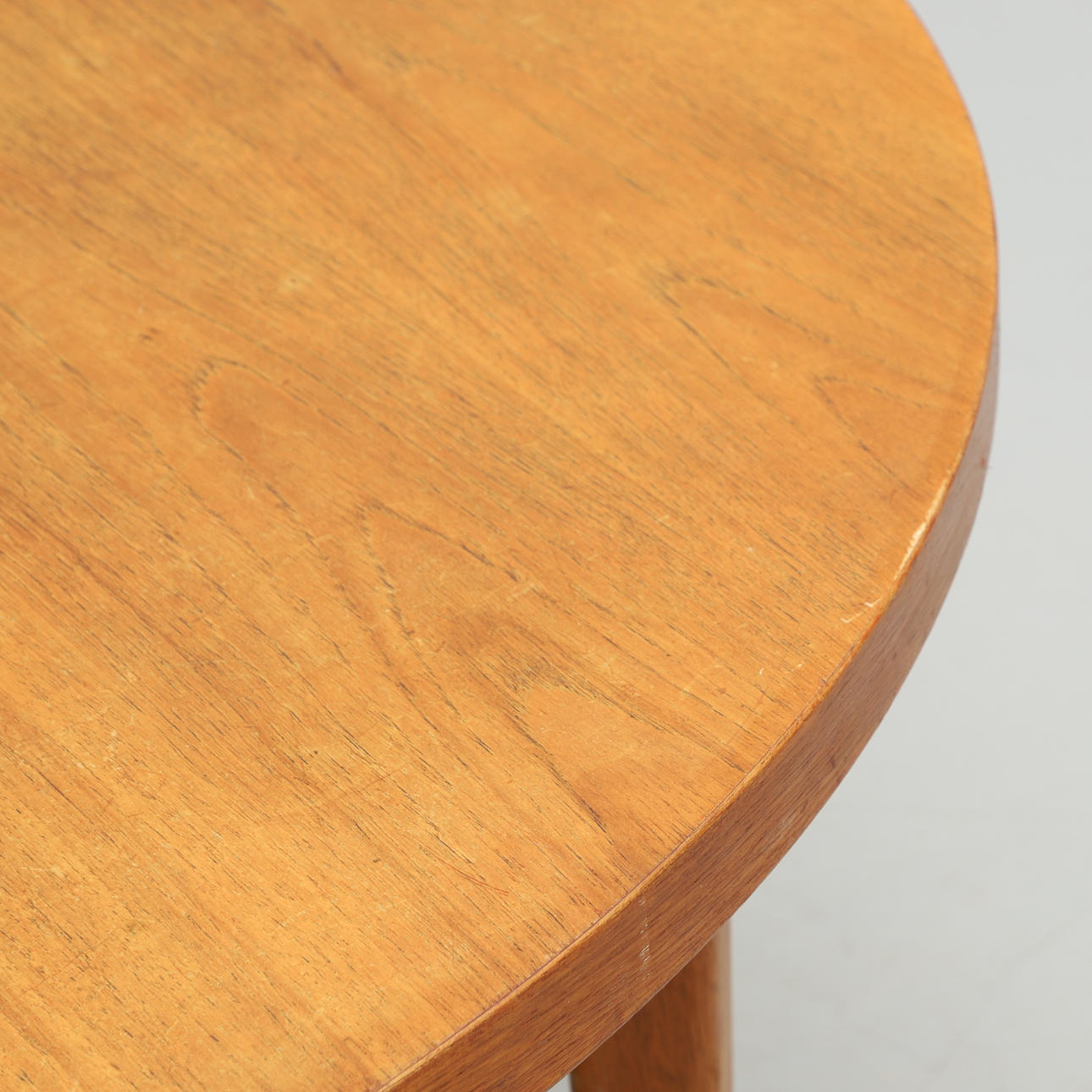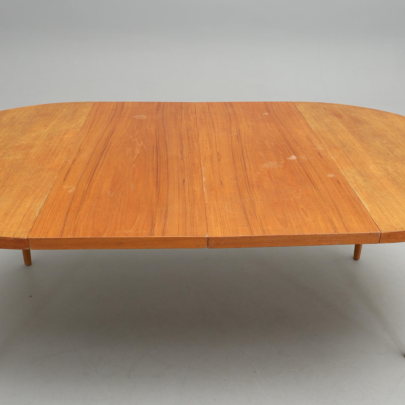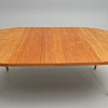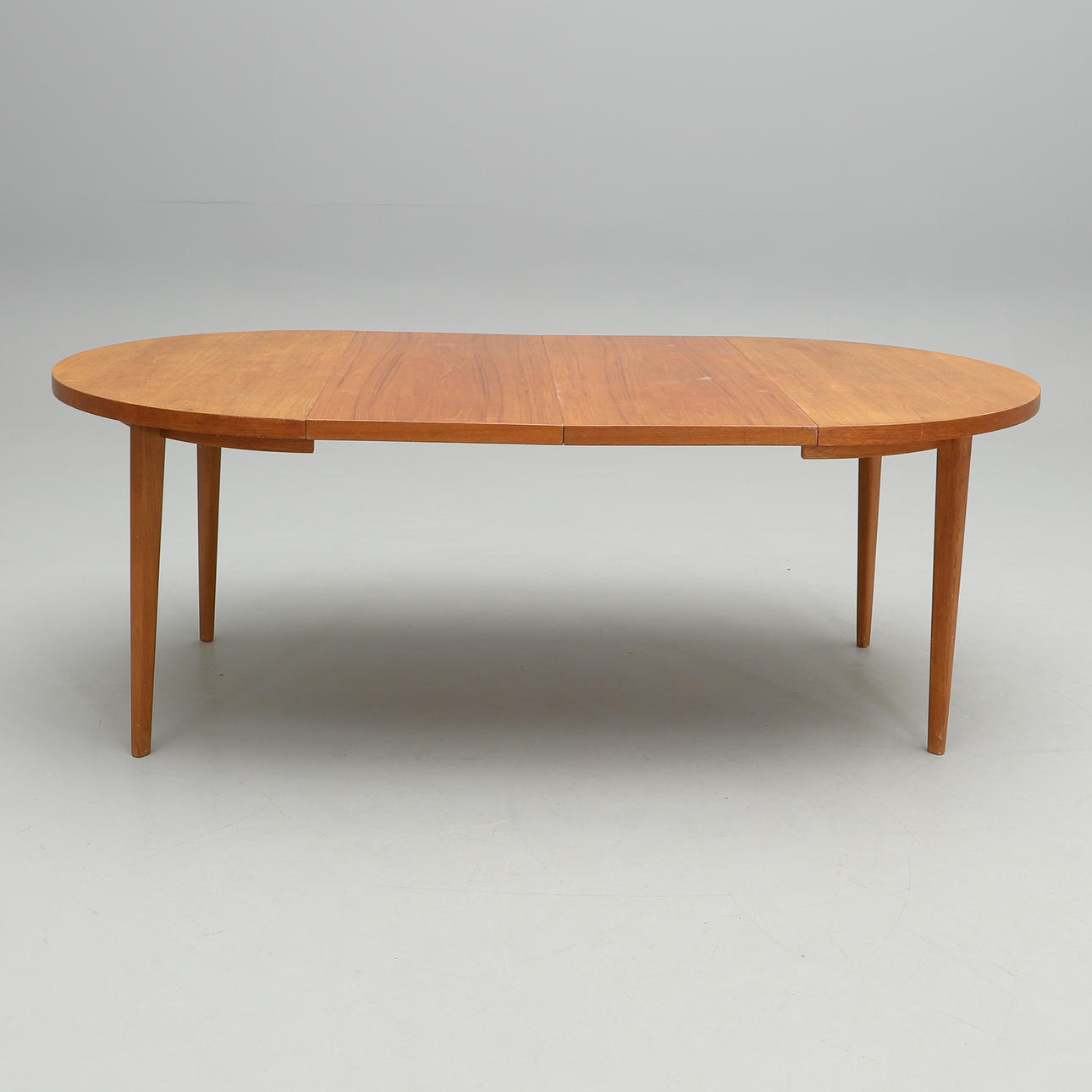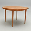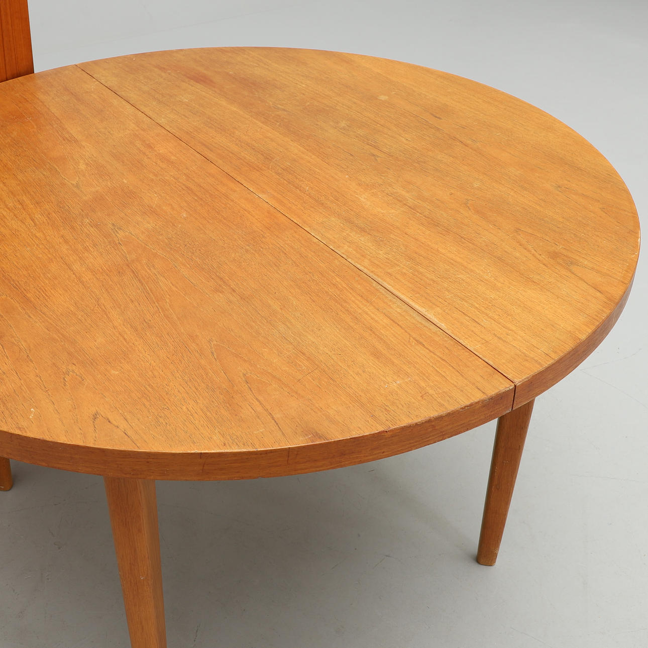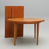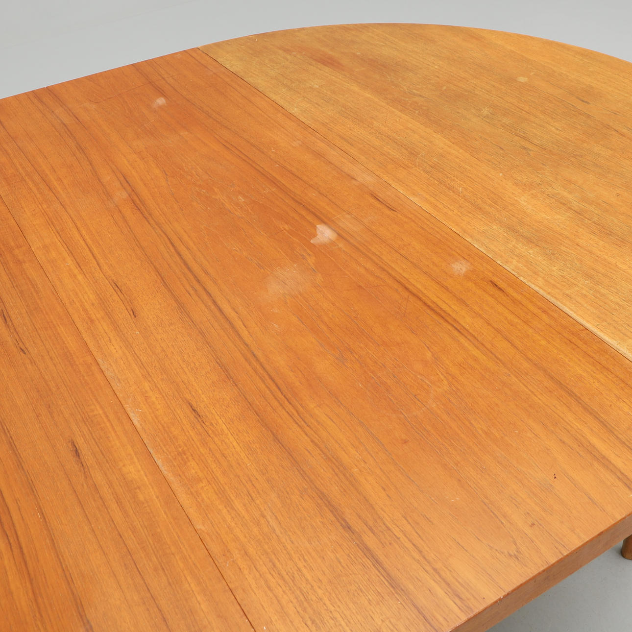 Oak and teak. Two extension leaves of 45 cm each. Dimensions: width 115-205, depth 115, height 72 cm.