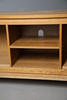 A modern light oak sideboard, with two cupboard doors either side a central fixed shelf. 60cm (h) x 131cm (w) x 45cm (d).