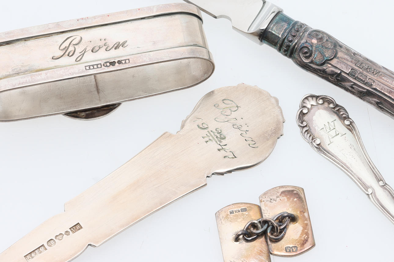 Engraving on spoons and napkin ring. Otherwise wear from use.