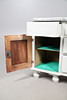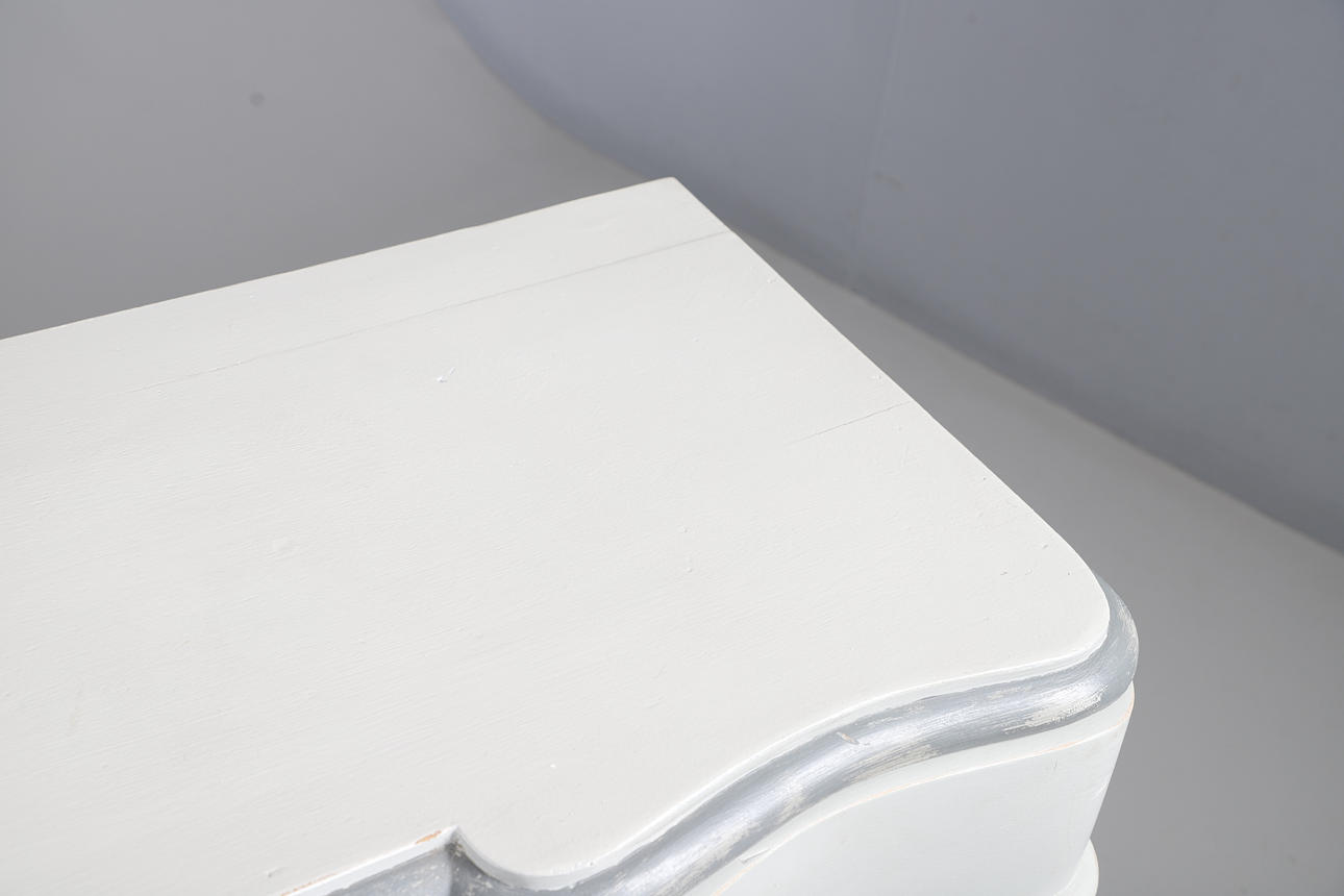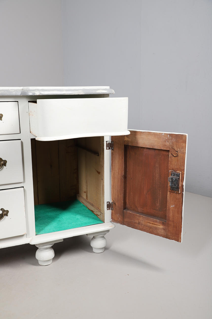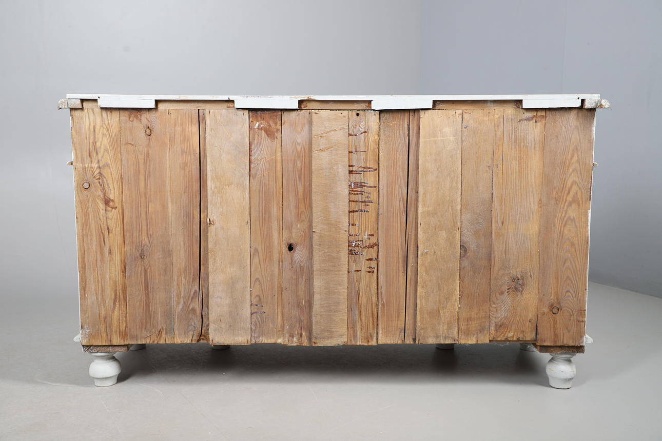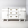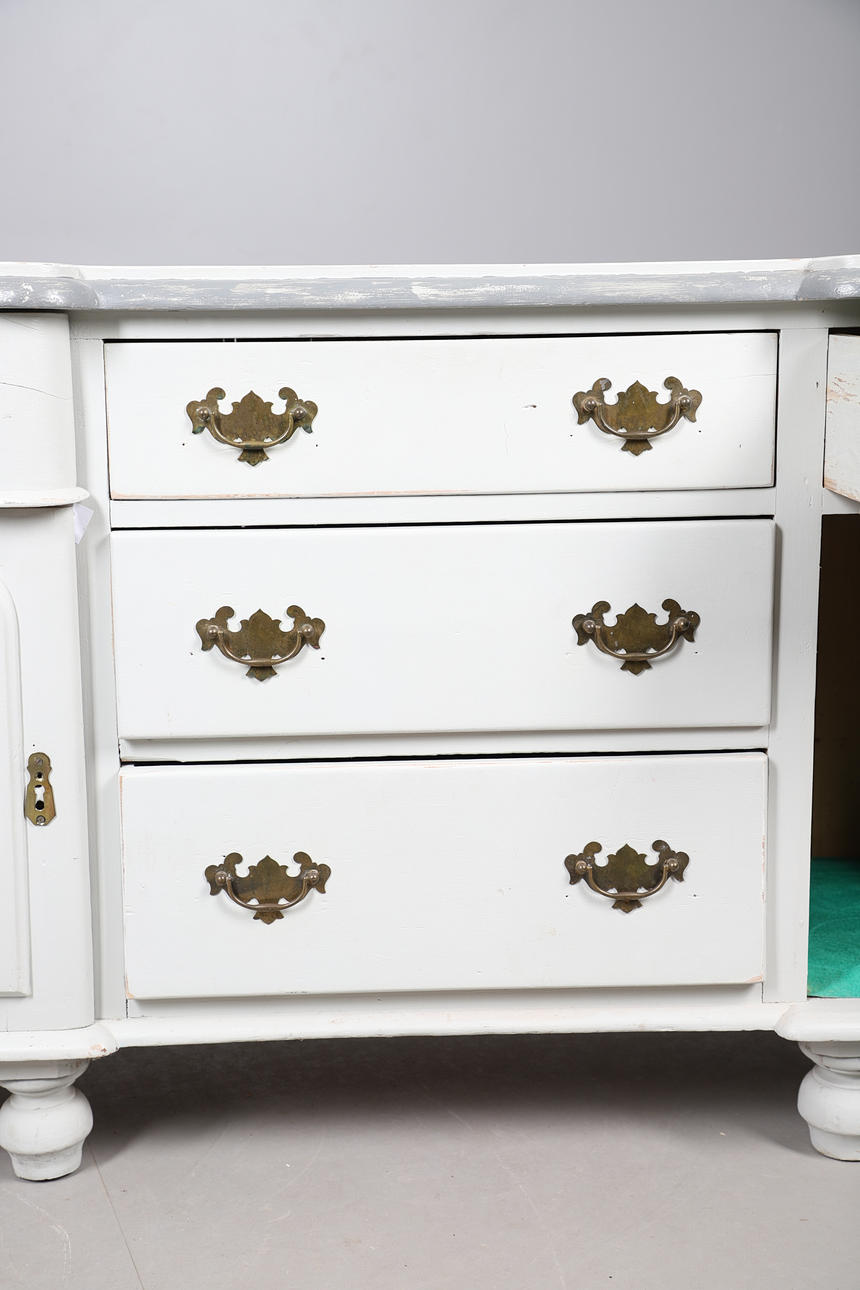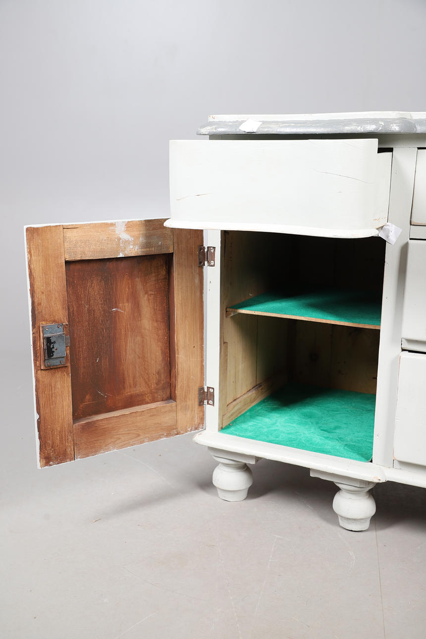 A Victorian grey painted dresser base, with two cupboard doors either side three graduated drawers with brass drop down handles, and raised on bun style supports. 76cm (h) x 136cm (w) x 48.5cm (d).