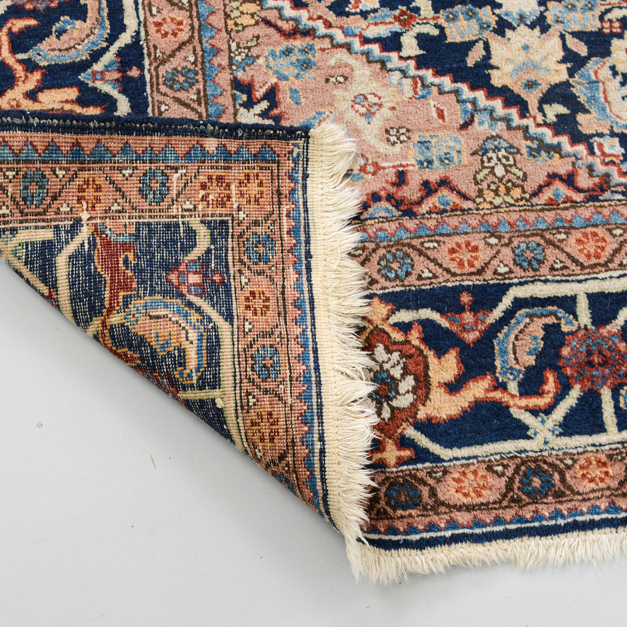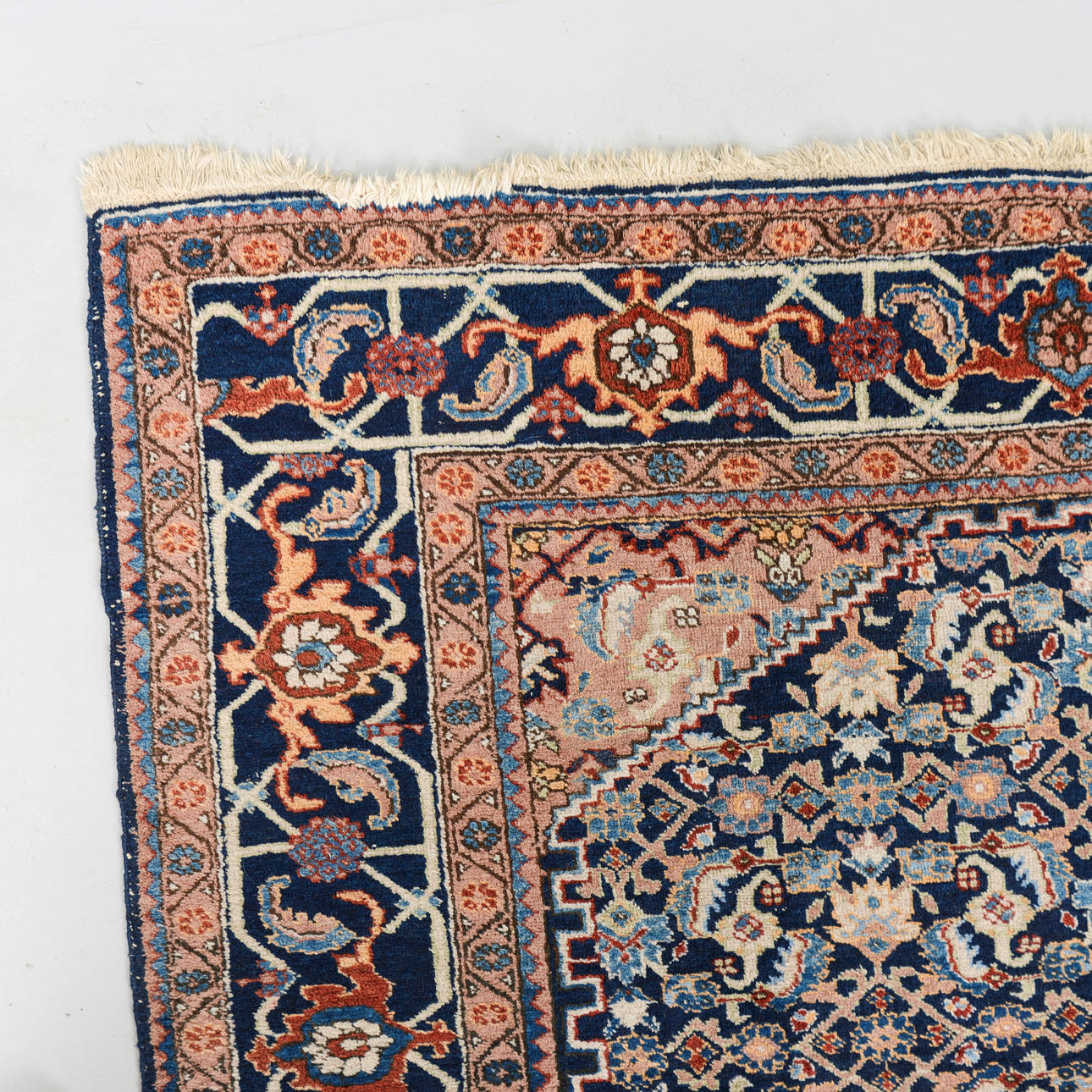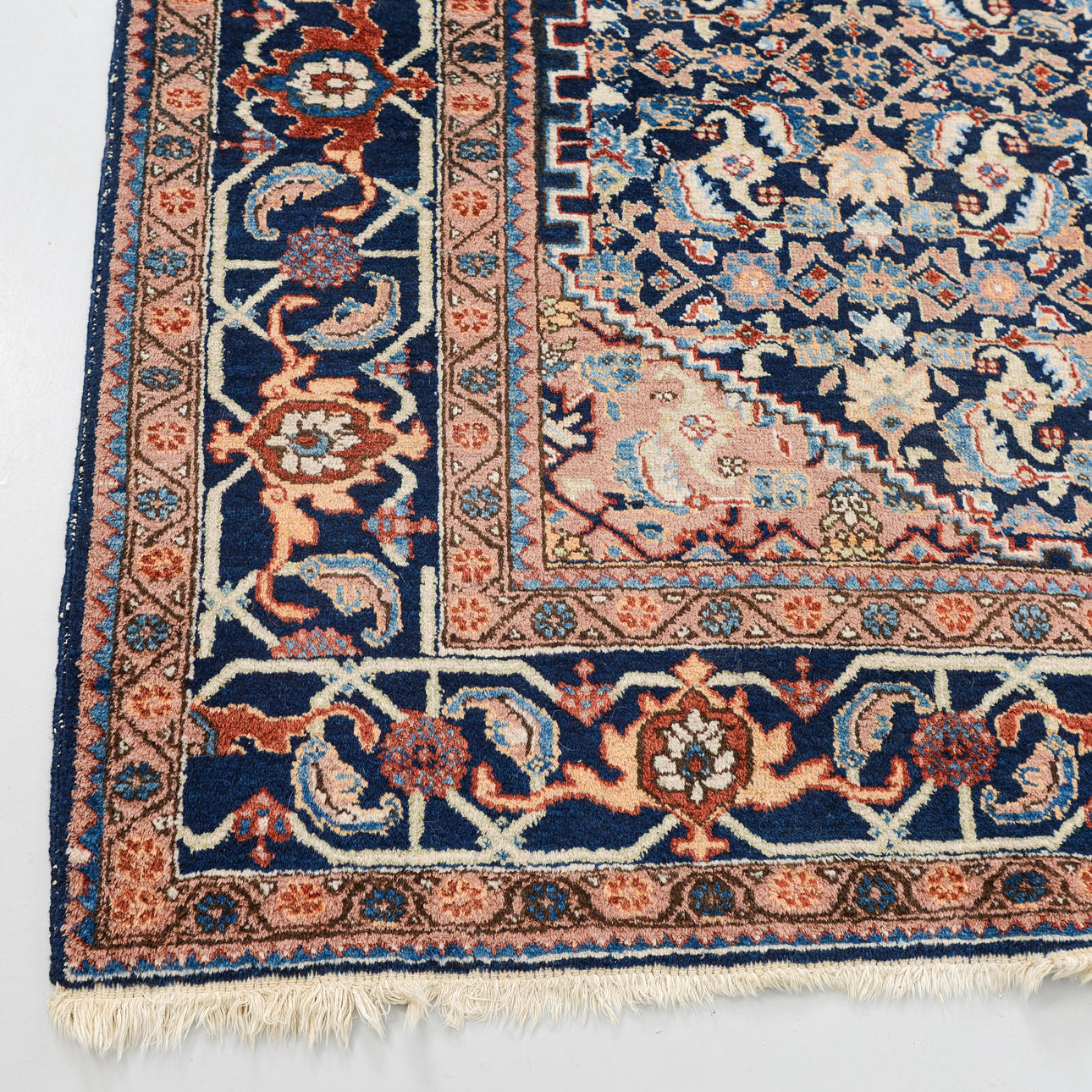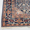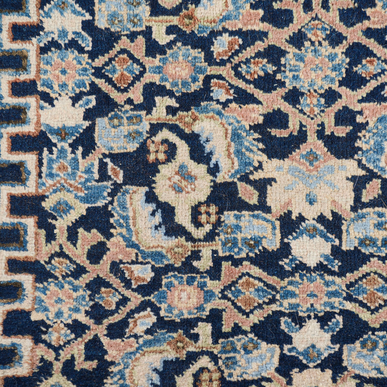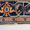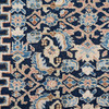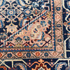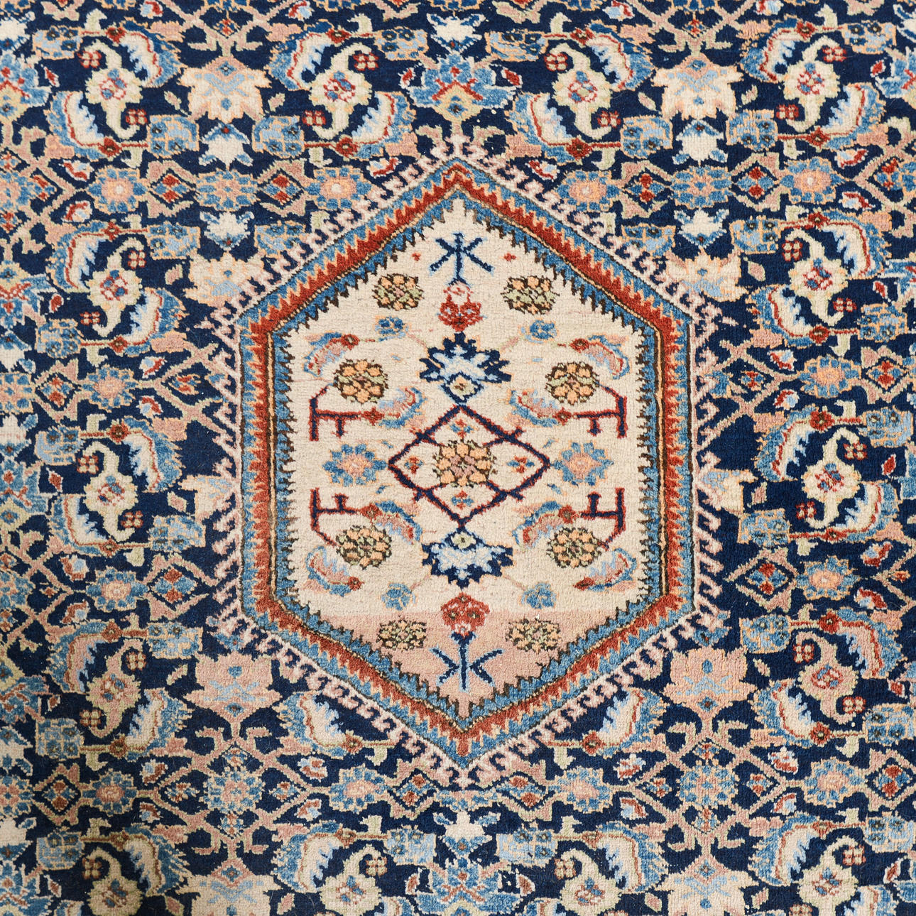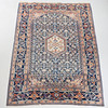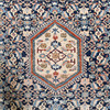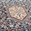 Richly ornamented carpet with a dense, symmetrical composition. The central field is dominated by an intricate floral pattern in shades of blue with accents of beige, red, and light blue, structured around a central, hexagonal medallion.