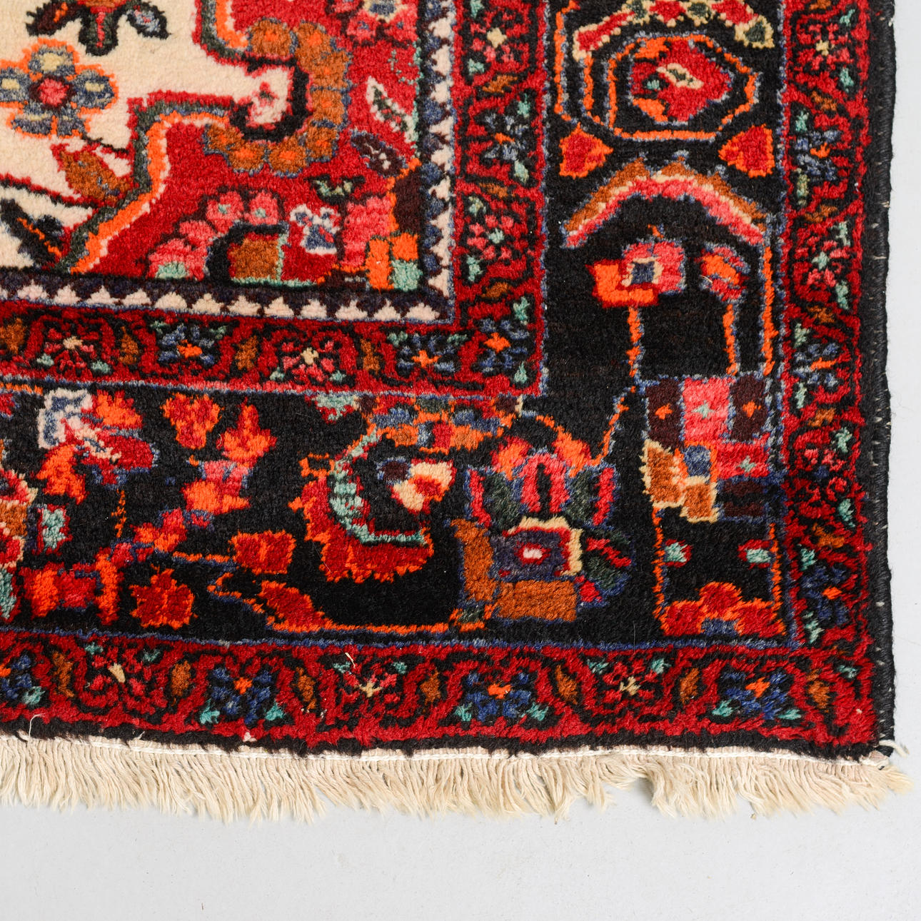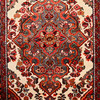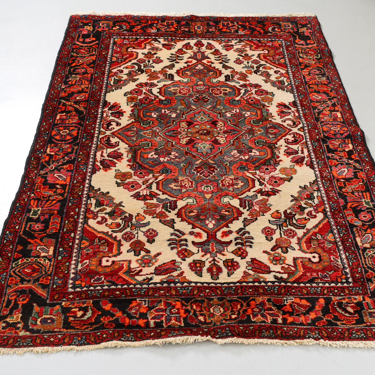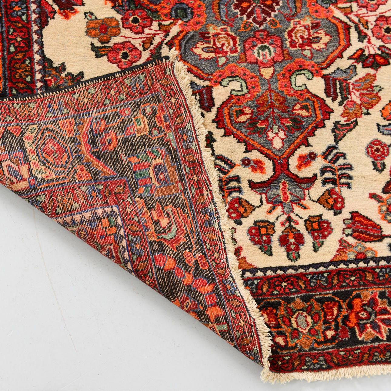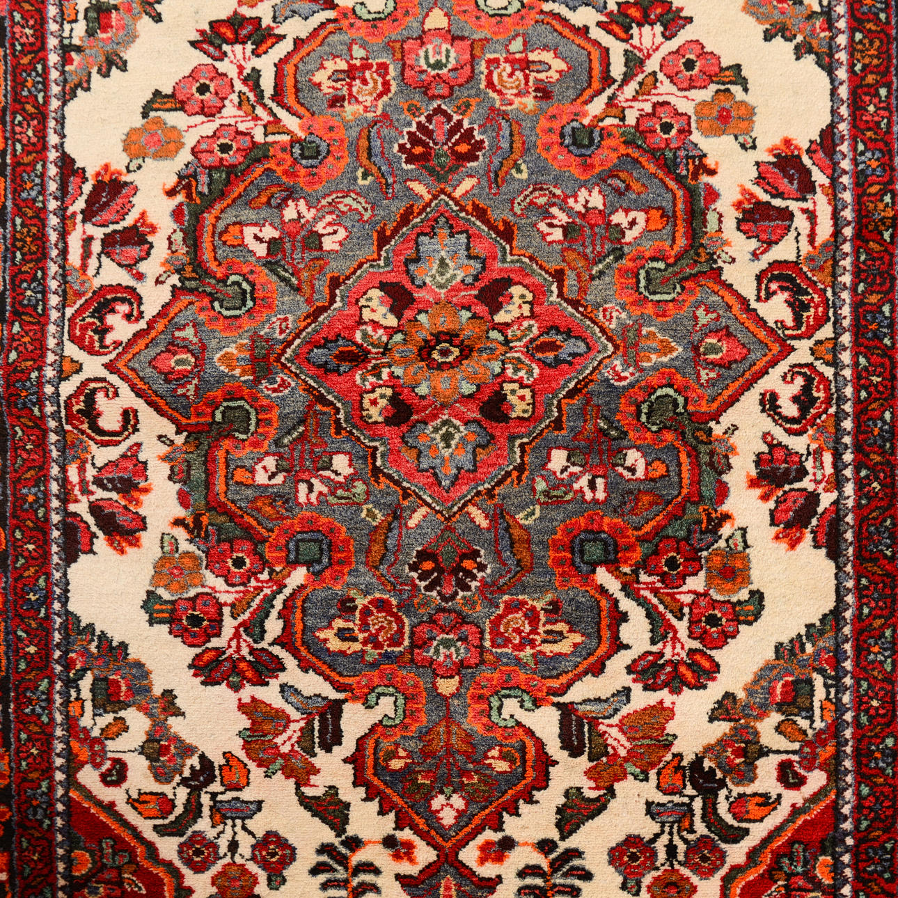 Central composition with a marked rhombic medallion in red and blue, surrounded by a dense, symmetrical field of stylized floral vines and palmettes. The light ivory-colored ground contrasts with the bold ornaments in red, dark blue, and touches of green.