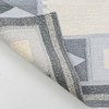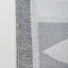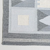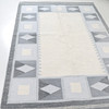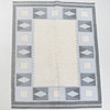 Strictly composed carpet with a light, unworked central field surrounded by a wide border composed of square fields in grey and light blue.